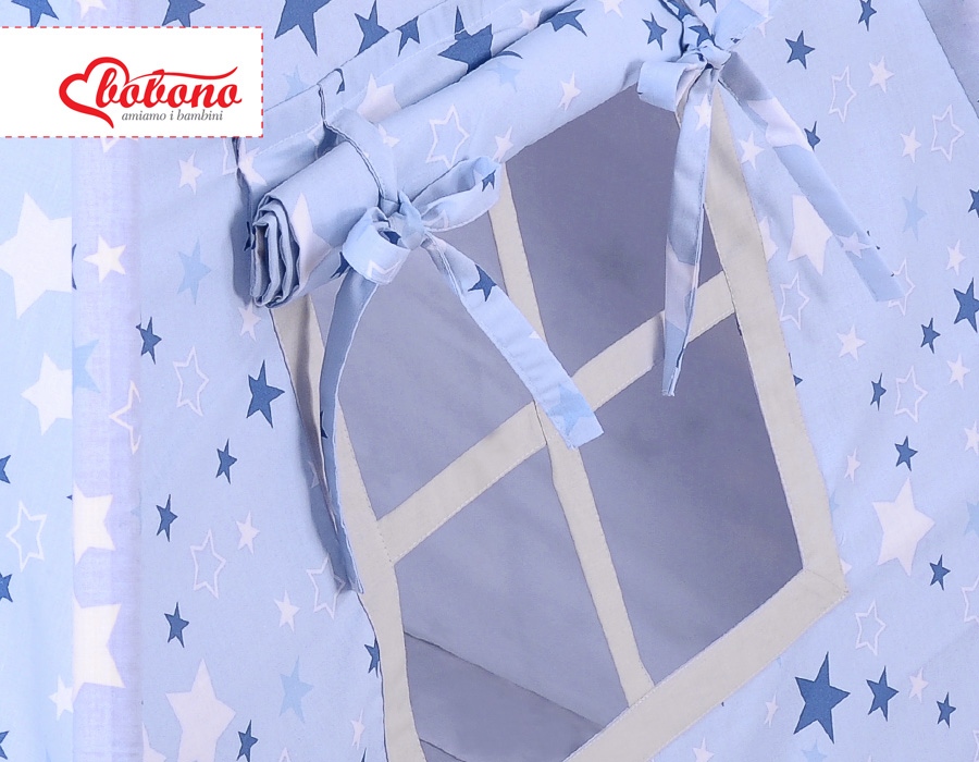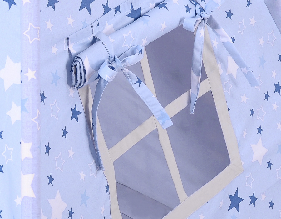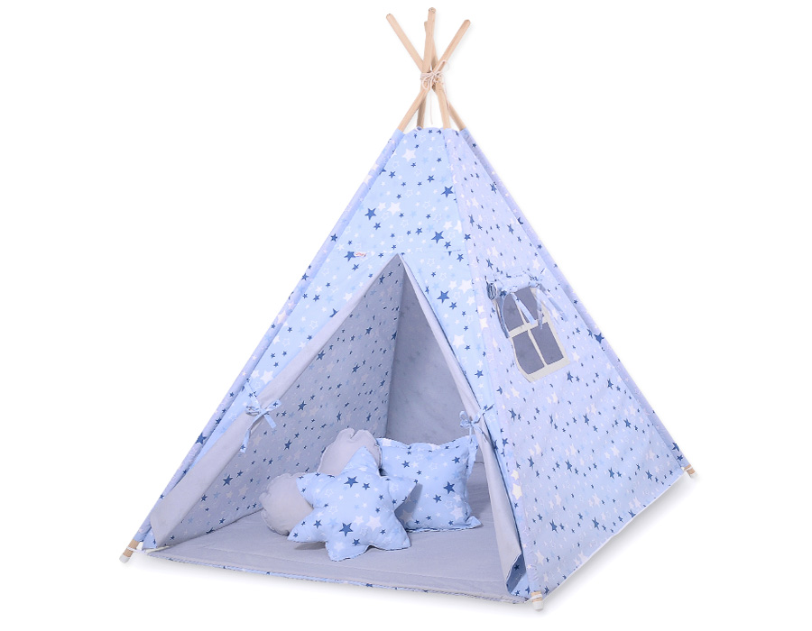 MINI Set: Teepee Kinderspiel-Zelt mit Spielmatte und Schmuckfedern GRATIS! - blaue Sternen/grau
