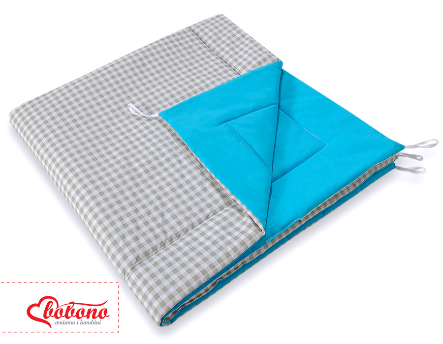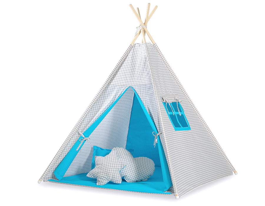 Stubenwagen » Spielzeug Kuscheltiere » Teepee Kinderspiel-Zelt » MINI Set: Tipi Zelt + Spielmatte » MINI Set: Teepee Kinderspiel-Zelt mit Spielmatte und Schmuckfedern GRATIS! - Grau kariert-türkis