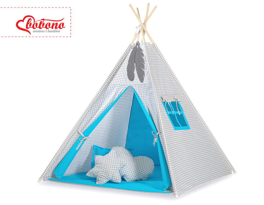 MINI Set: Teepee Kinderspiel-Zelt mit Spielmatte und Schmuckfedern GRATIS! - Grau kariert-türkis
