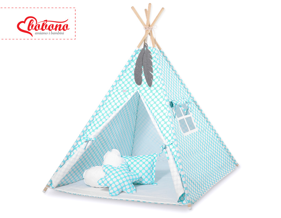 MINI Set: Tipi Kinderspiel-Zelt mit Spielmatte und Schmuckfedern GRATIS! - türkis Punkt-Muster