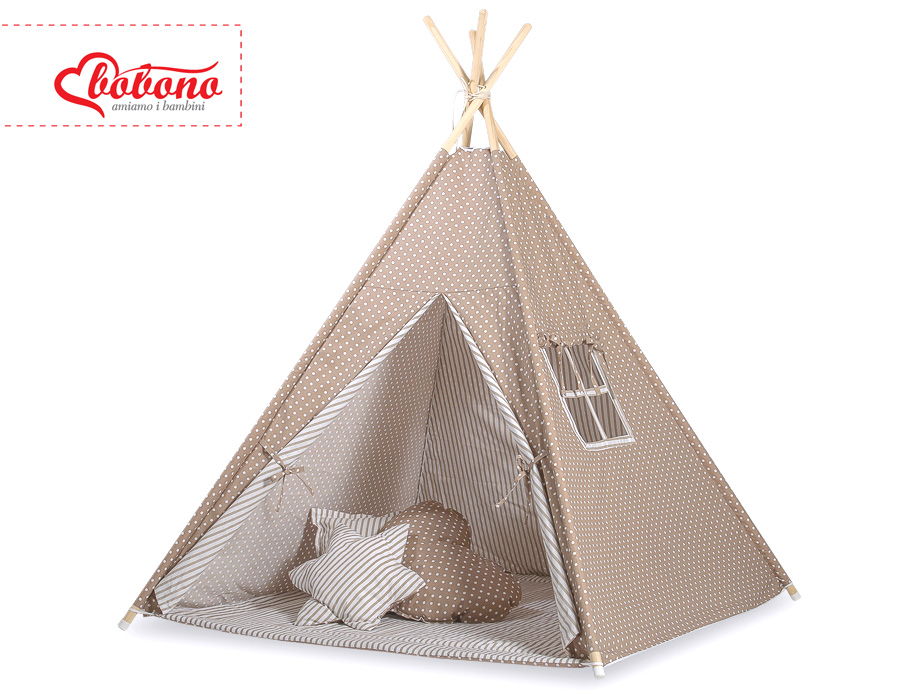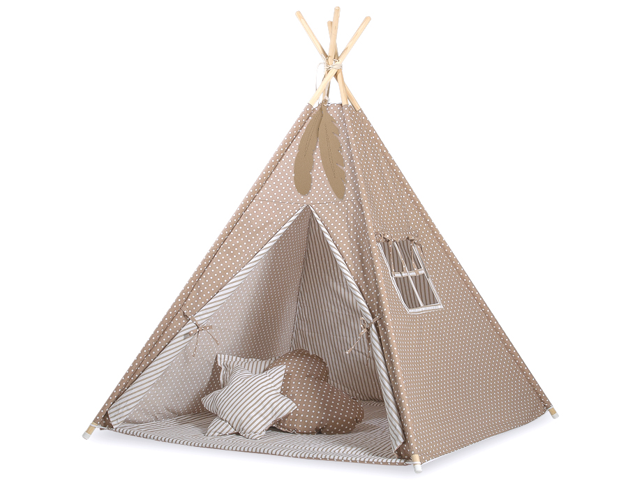 MINI Set: Tipi Zelt mit Spielmatte und Schmuckfedern GRA - Braun-Punktemuster/beige sestreift
