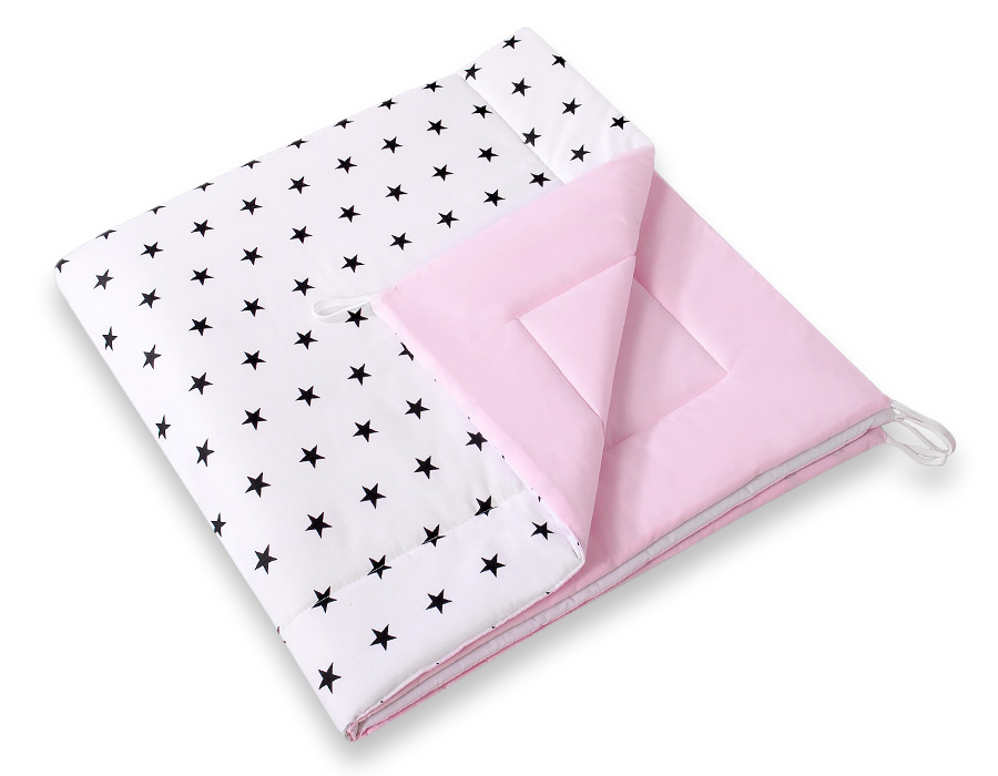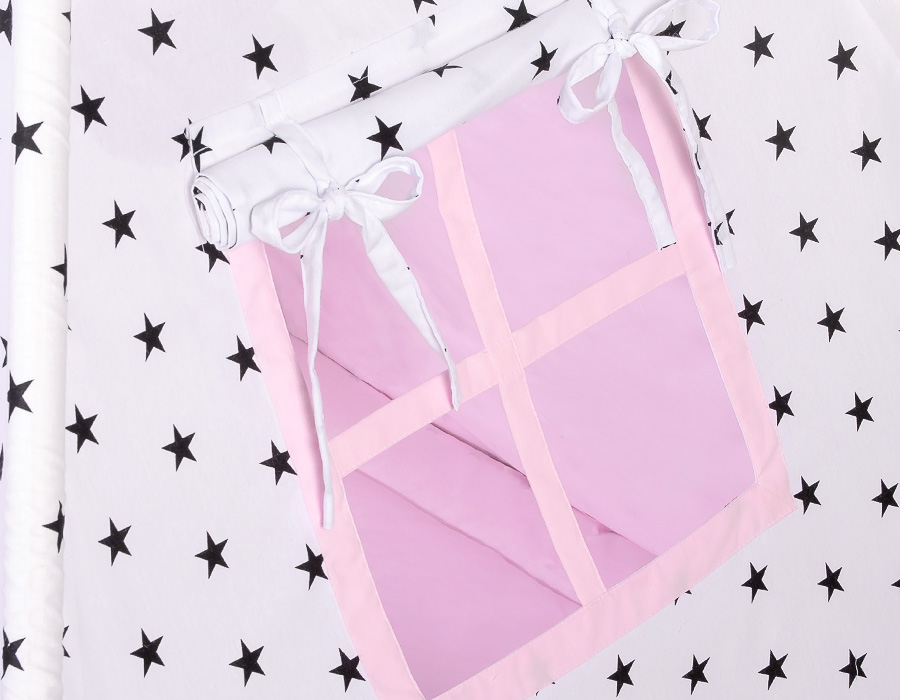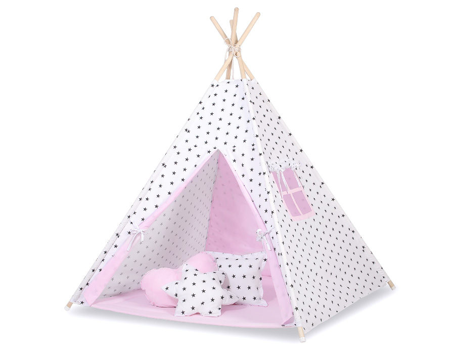 Stubenwagen » Spielzeug Kuscheltiere » Teepee Kinderspiel-Zelt » MINI Set: Tipi Zelt + Spielmatte » MINI Set: Tipi-Zelt mit Spielmatte und Schmuckfedern GRATIS! - Schwarze Sternchen/rosa