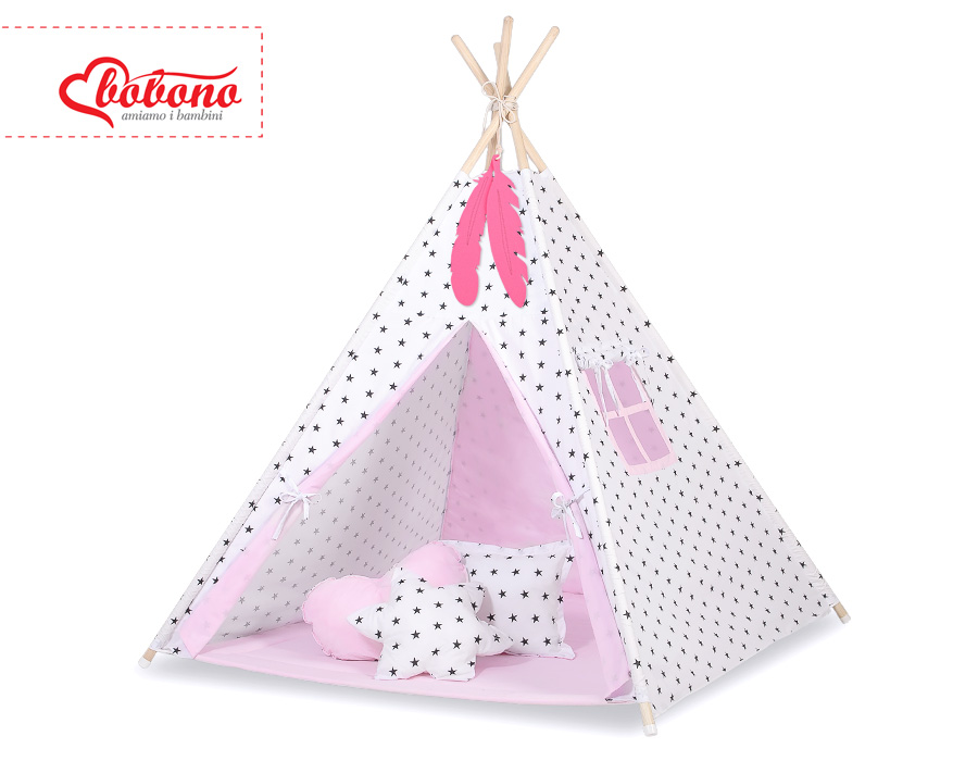 MINI Set: Tipi-Zelt mit Spielmatte und Schmuckfedern GRATIS! -  Schwarze Sternchen/rosa