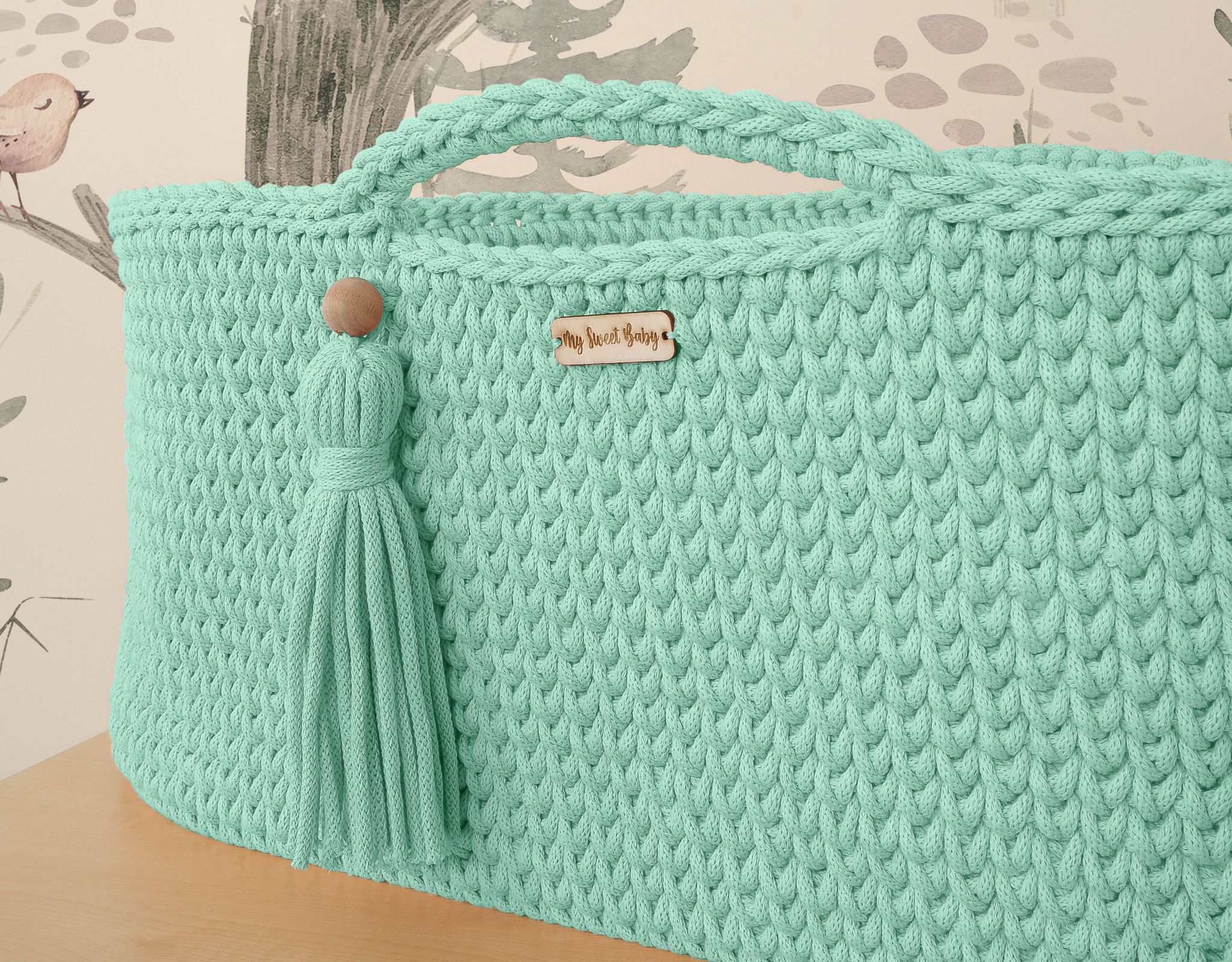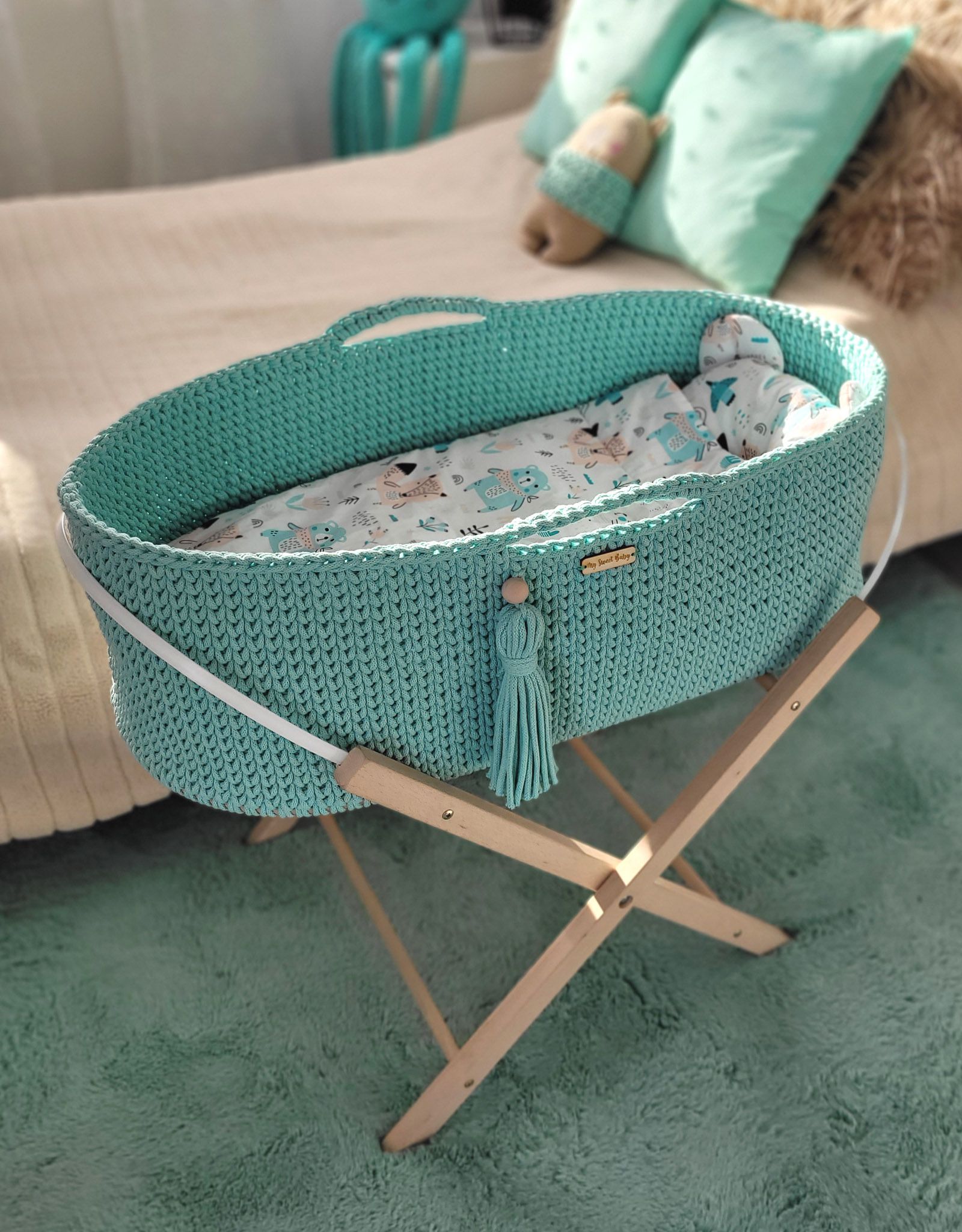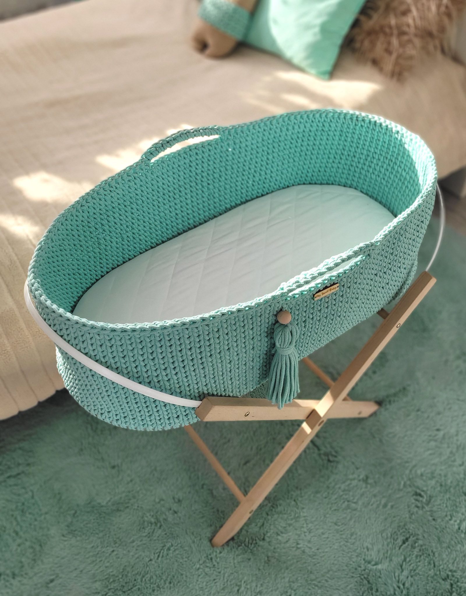 Moseskorb Boho für Babys - Minze Ein von Hand gefertigter Korb aus Baumwolleschnur im Boho-Stil. Perfekt für jedes Kleinkind – es sorgt für sicheren und friedlichen Schlaf. Die Baumwollwände ermöglichen eine ausreichende Luftzirkulation. Die Matratze besteht aus dickem, gepresstem, zertifiziertem Vlies mit entsprechender Weichheit und abnehmbarem Bezug. Dank der Griffe lässt sich das Bettchen leicht tragen und das Kleinkind kann immer in Ihrer Nähe sein. Am Griff befindet sich ein handgefertigter Kordel in der Farbe des Korbes mit einer Holzperle.