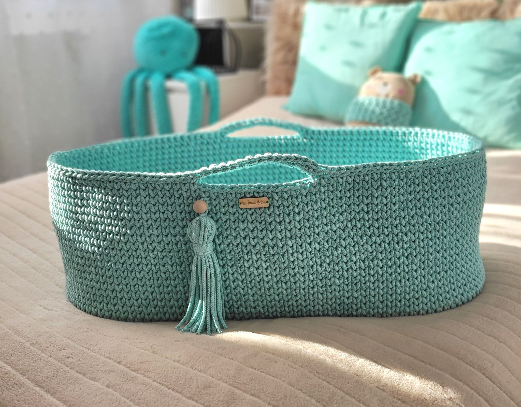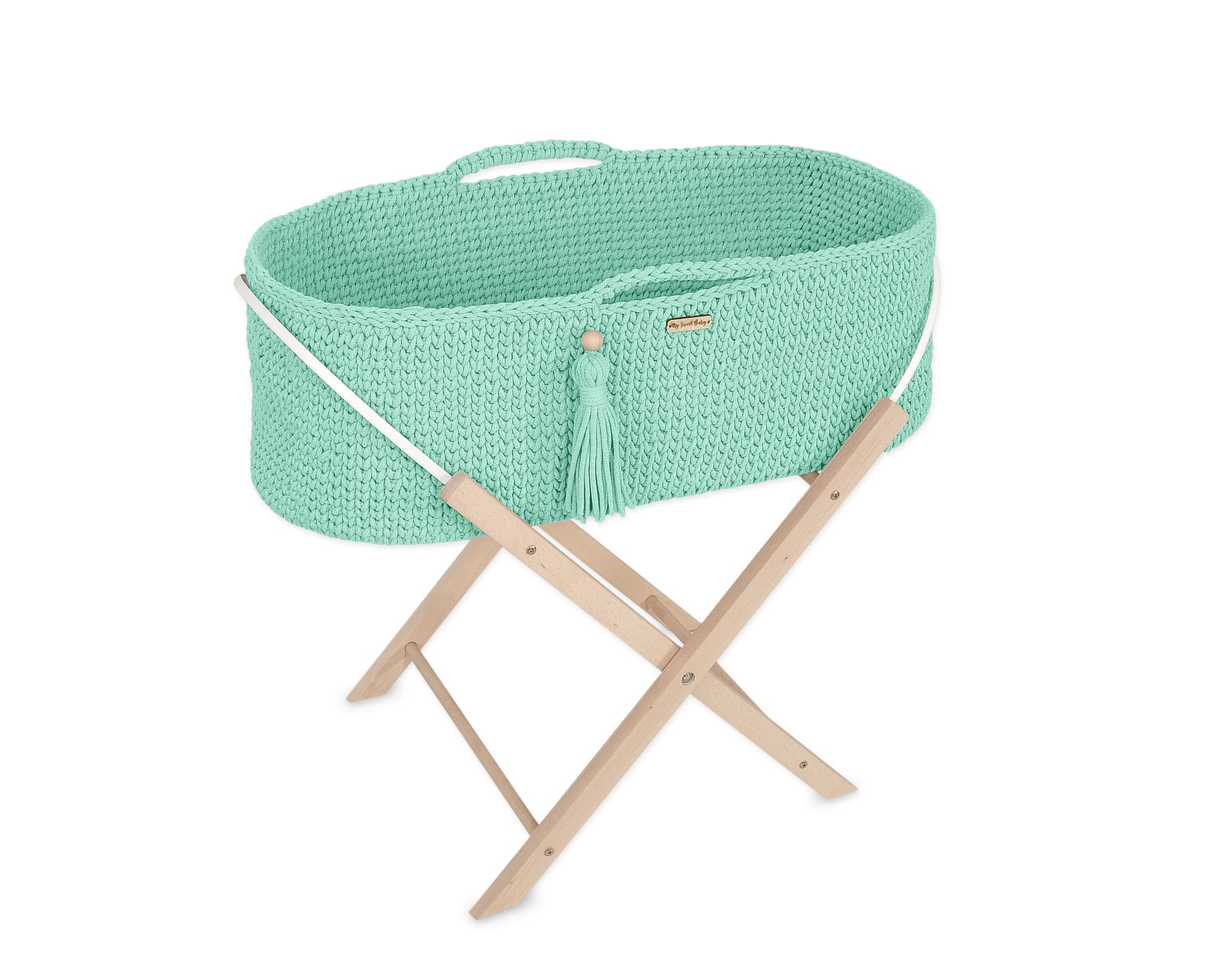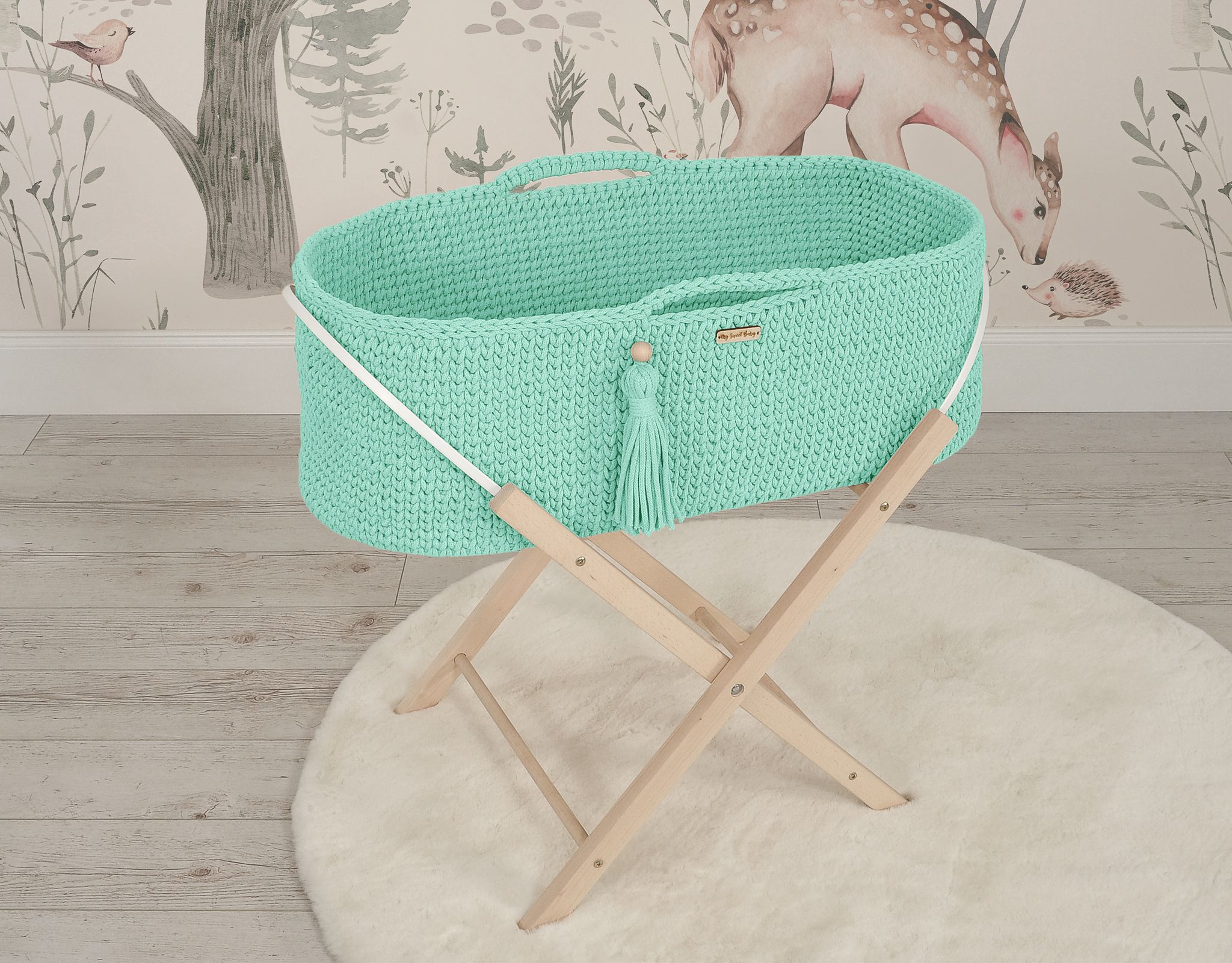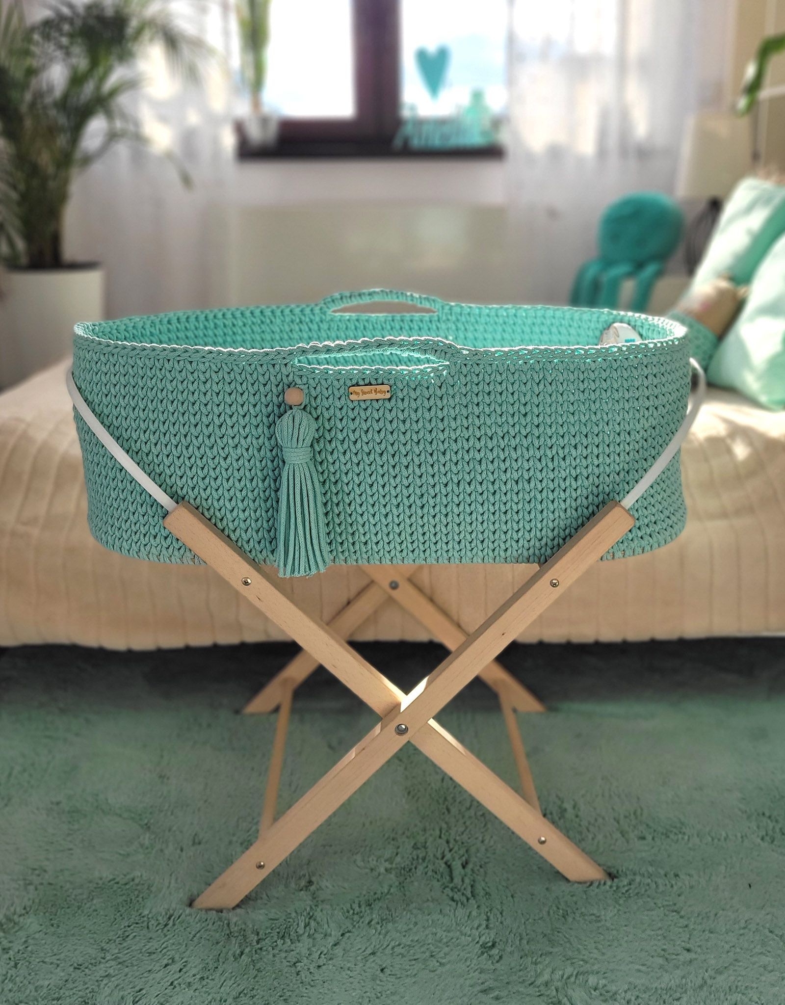 Moseskorb Boho für Babys mit Ständer - Minze Ein von Hand gefertigter Korb aus Baumwolleschnur im Boho-Stil. Perfekt für jedes Kleinkind – es sorgt für sicheren und friedlichen Schlaf. Die Baumwollwände ermöglichen eine ausreichende Luftzirkulation. Die Matratze besteht aus dickem, gepresstem, zertifiziertem Vlies mit entsprechender Weichheit und abnehmbarem Bezug. Dank der Griffe lässt sich das Bettchen leicht tragen und das Kleinkind kann immer in Ihrer Nähe sein. Am Griff befindet sich ein handgefertigter Kordel in der Farbe des Korbes mit einer Holzperle. Wird mit einem stabilen Holzständer geliefert. Auf dem boho moses basket angebracht, erleichtert er den täglichen Gebrauch.