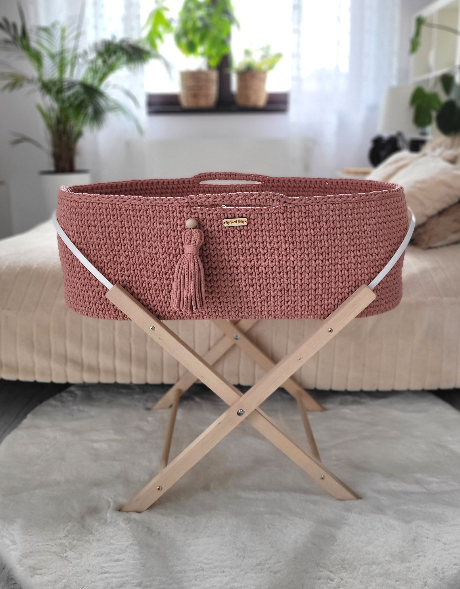 Ein von Hand gefertigter Korb aus Baumwolleschnur im Boho-Stil. Perfekt für jedes Kleinkind – es sorgt für sicheren und friedlichen Schlaf. Die Baumwollwände ermöglichen eine ausreichende Luftzirkulation. Dank der Griffe lässt sich das Bettchen leicht tragen und das Kleinkind kann immer in Ihrer Nähe sein. Am Griff befindet sich ein handgefertigter Kordel in der Farbe des Korbes mit einer Holzperle.