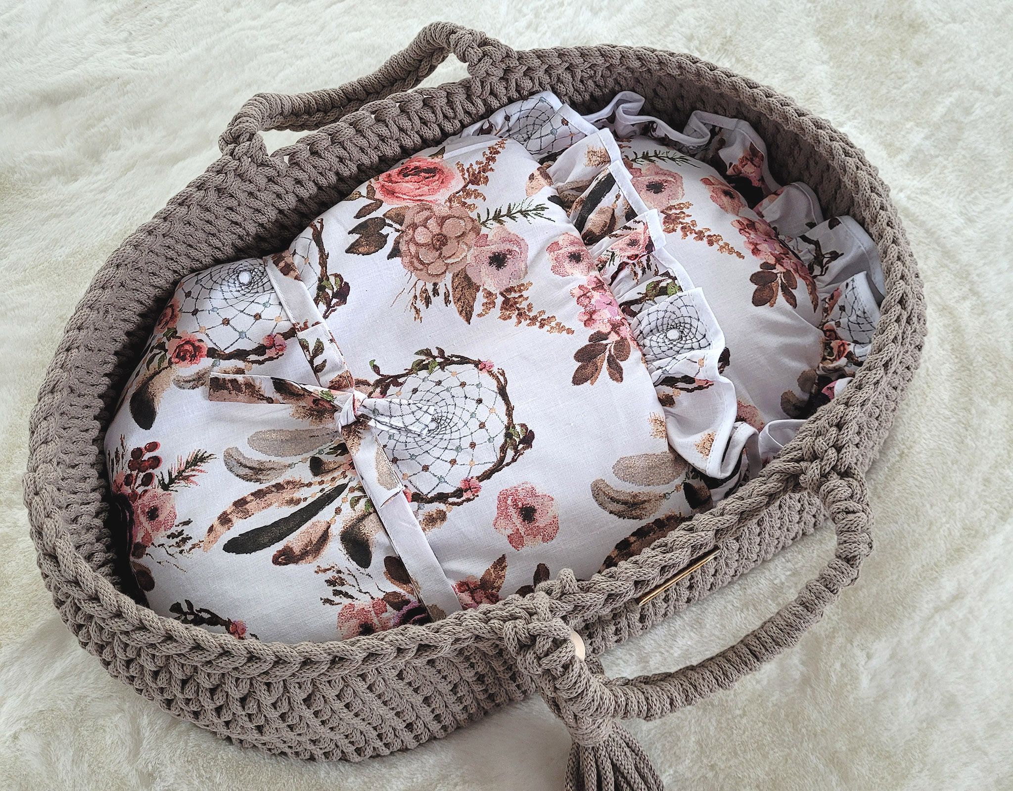 Eine stilvolle Miniatur unseres BOHO Baby Moses Basket. Großer Puppenspaß für jedes kleine Mädchen! 100% polnisches handgefertigtes Produkt. Schönes Design, das in jedes Mädchenzimmer passt. Ein ideales Geschenk für Ihren Geburtstag. Handgefertigt aus Baumwollschnur. Die Seiten des Korbes sind sorgfältig aus dicker Schnur von höchster Qualität geflochten. Die spezielle Webart garantiert, dass die Seiten stabil sind, sich nicht verformen und sich weich und angenehm anfühlen. Die langen Griffe erleichtern den Gebrauch und das Tragen des Moses Basket, der auch als Puppentrage verwendet werden kann. Am Griff befindet sich ein langer Ziergriff aus derselben Kordel, der mit einer Holzperle verziert ist. Der starre, stabile Boden des Moseskorbs ist aus weißem Karton, der Boden in Naturfarbe. Der Moses Basket wird komplett mit einer weißen Matratze aus weichem Hafermehl und weißem Baumwollstoff geliefert. Zusätzlich finden Sie in unserem Angebot auch schöne bunte Puppenbetten, Puppenbettwäsche und Puppentüten, die perfekt zu den Puppen-Moses-Körben passen. Mit uns vervollständigen Sie ein schönes Set für Ihre geliebten Puppen, das das Spielen zu Hause noch schöner macht.
