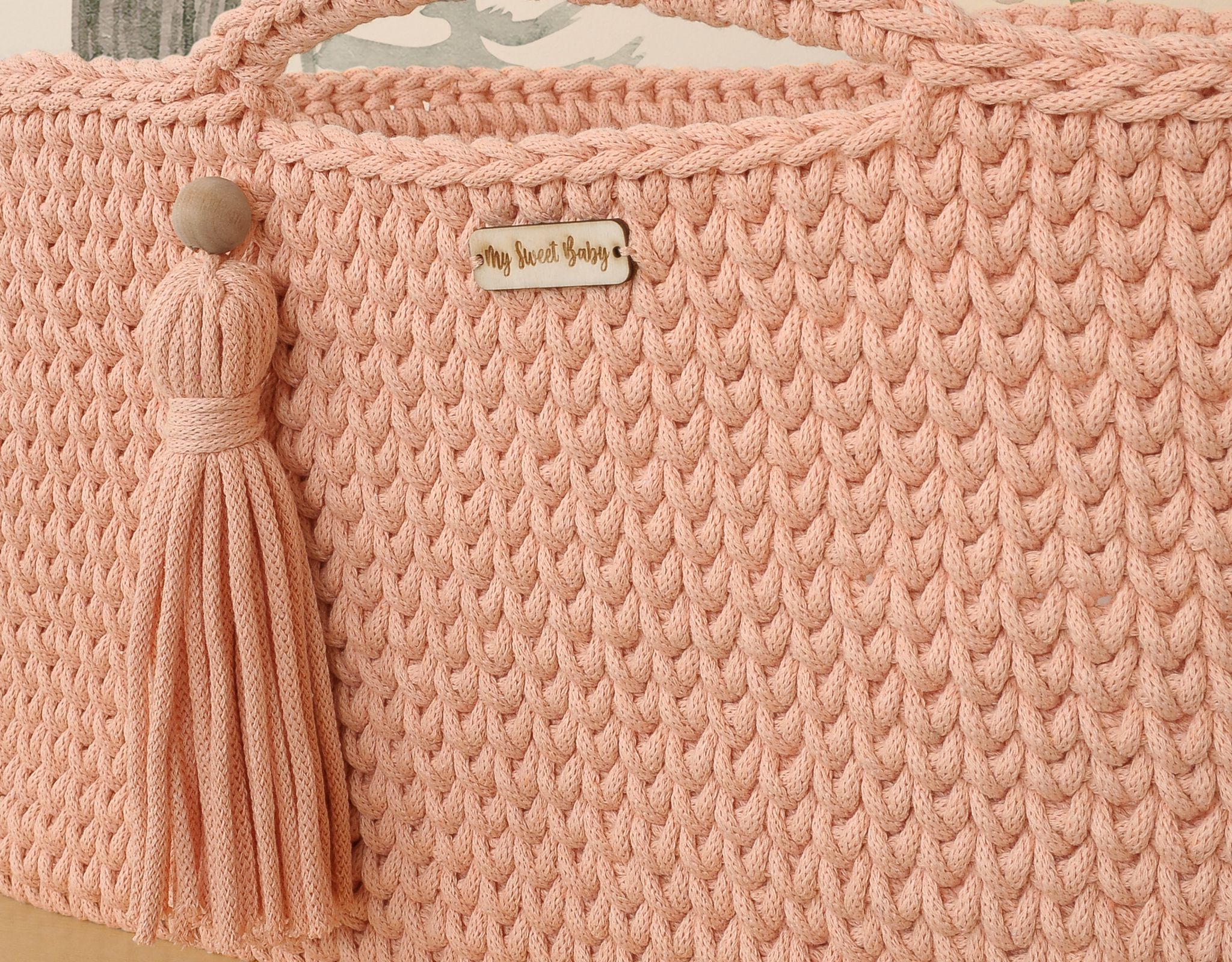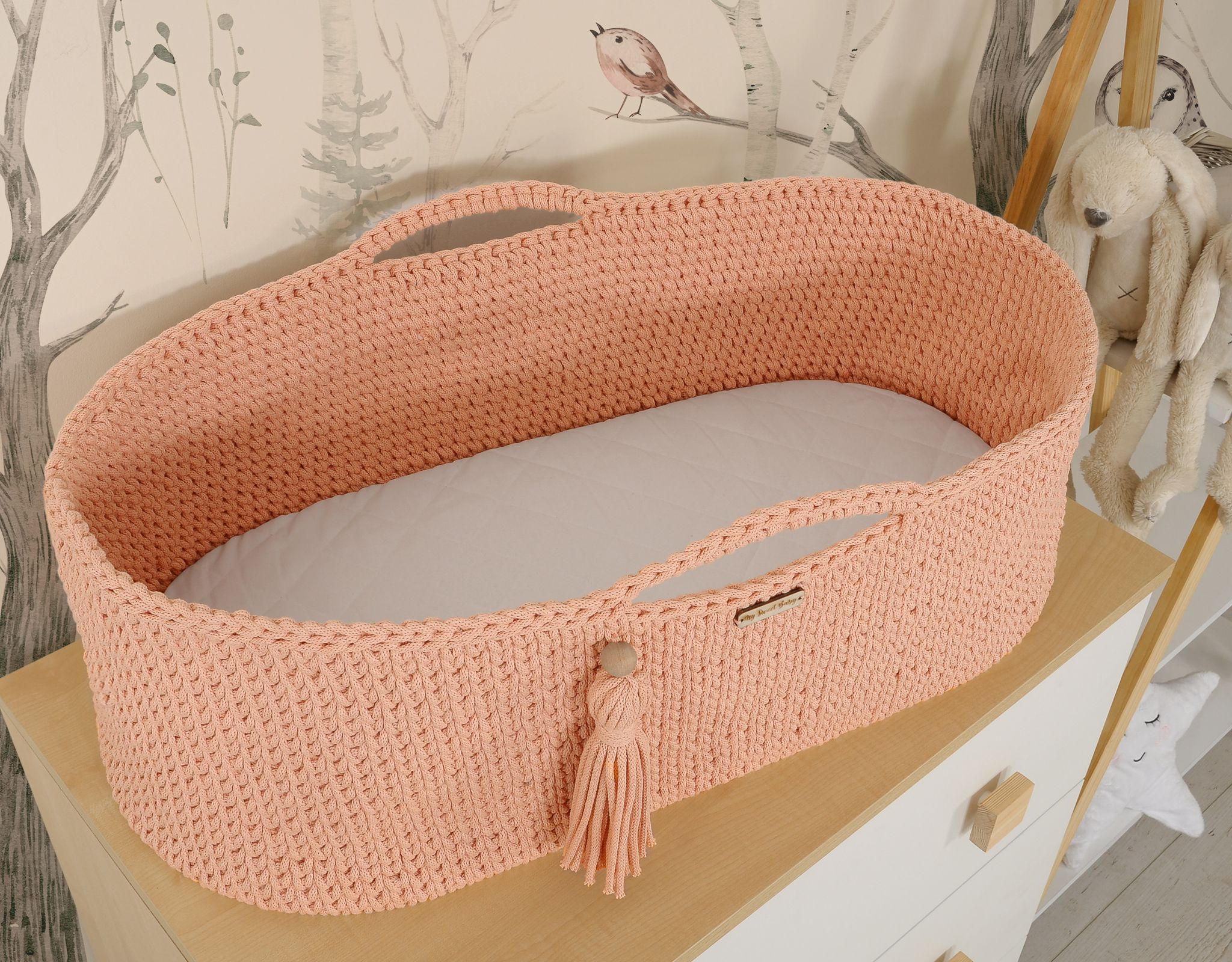 Moseskorb Boho Handmade - Lachs Ein von Hand gefertigter Korb aus Baumwollschnur im Boho-Stil. Perfekt für jedes Kleinkind – es sorgt für sicheren und friedlichen Schlaf. Die Baumwollwände ermöglichen eine ausreichende Luftzirkulation. Die Matratze besteht aus dickem, gepresstem, zertifiziertem Vlies mit entsprechender Weichheit und abnehmbarem Bezug. Dank der Griffe lässt sich das Bettchen leicht tragen und das Kleinkind kann immer in Ihrer Nähe sein. Am Griff befindet sich ein handgefertigter Kordel in der Farbe des Korbes mit einer Holzperle.