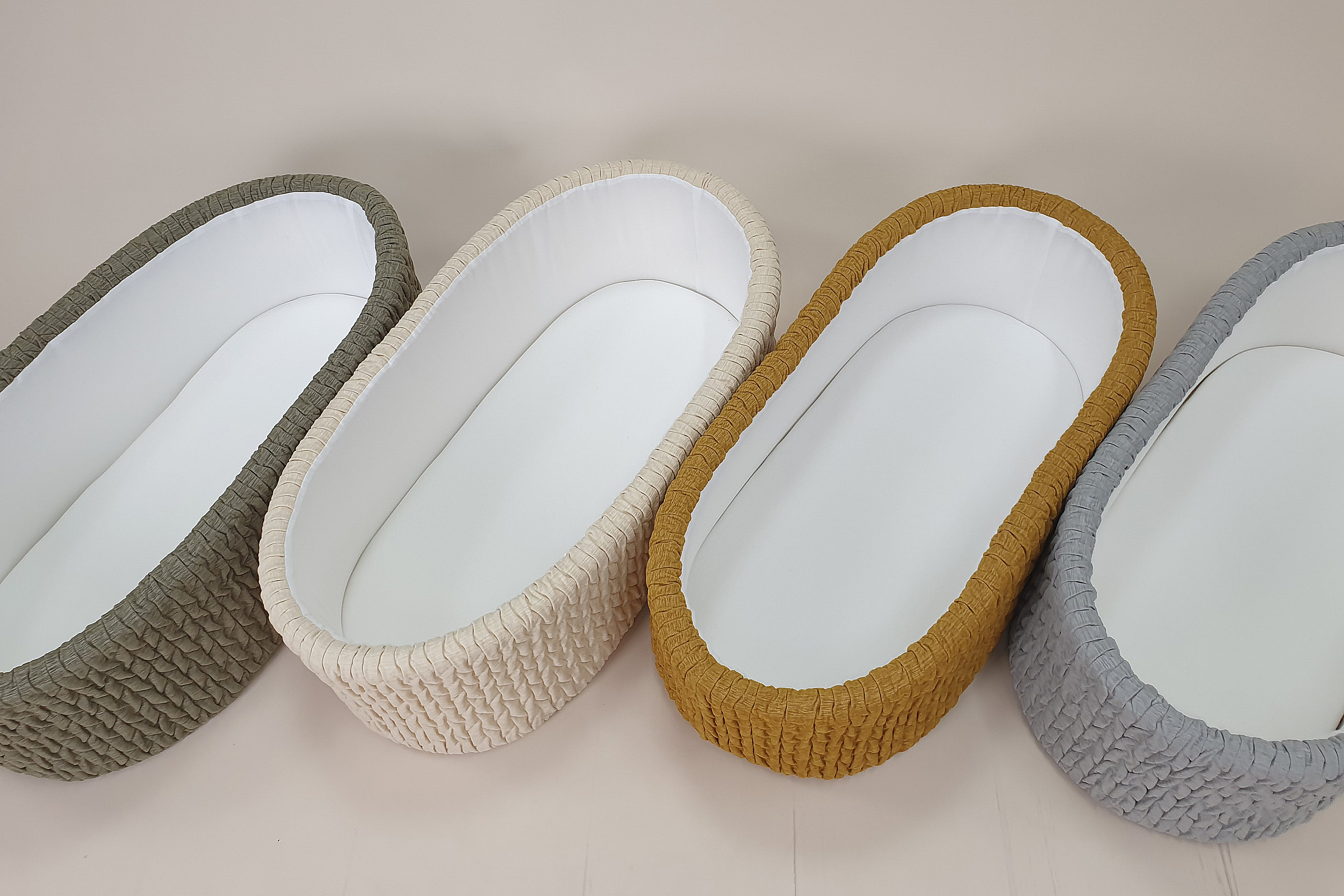 Der Cosy Moseskorb ist in vier stilvollen Farbvarianten erhältlich: Creme, Senfgelb, Khaki und Grau. Diese Optionen fügen sich perfekt in jedes Interieur ein.