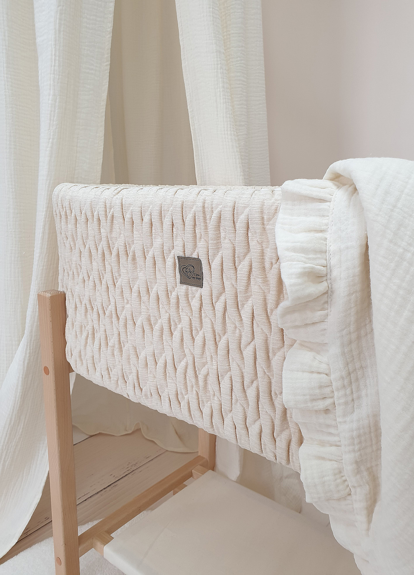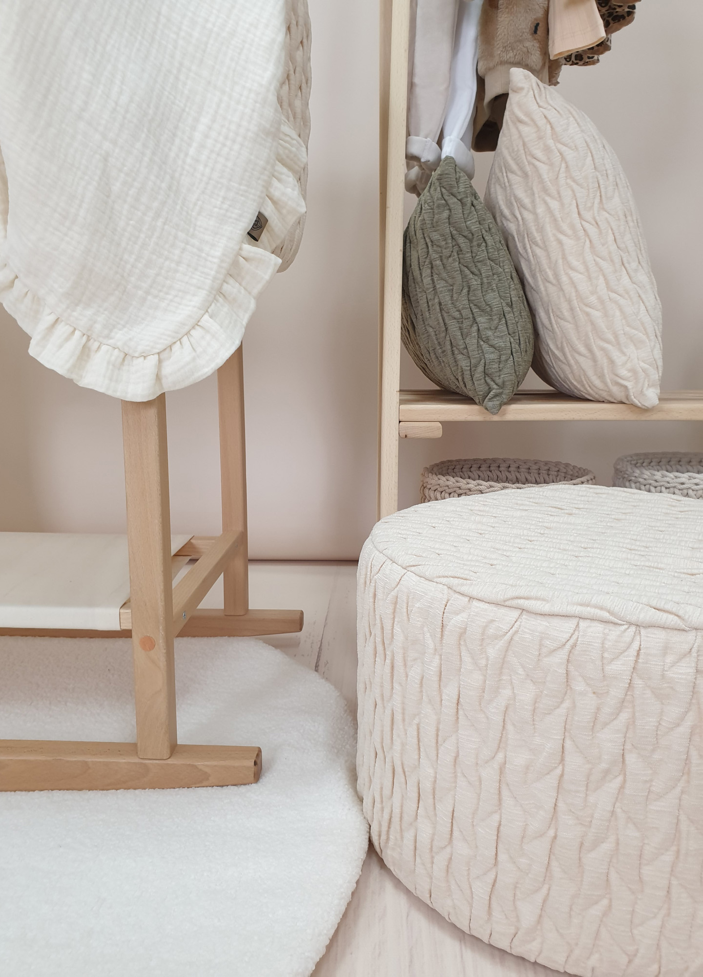 Die Innenseite des Moseskorbs ist aus weichem, weißem Baumwolljersey gefertigt und mit Schaumstoff gepolstert, um Ihrem Baby eine behagliche Umgebung zu schaffen. Die Außenseite ist aus strapazierfähigem, zertifiziertem Möbelstoff im modernen Zopfmuster (100% Polyester, STANDARD 100 by OEKO-TEX®), was dem Moseskorb eine elegante und zeitlose Note verleiht.