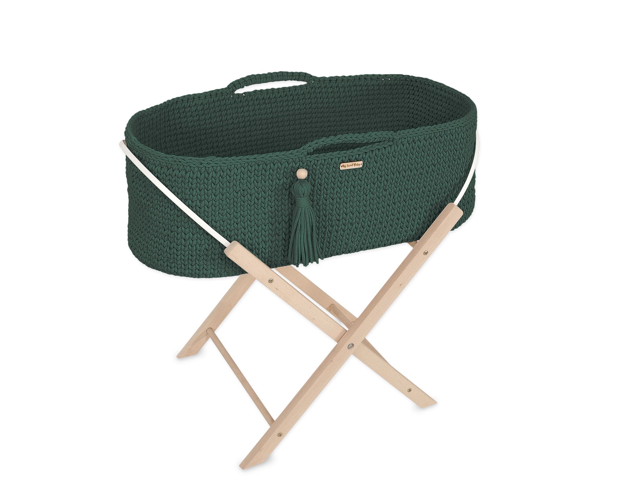 Moseskorb mit Ständer Boho Handmade Flaschengrün Ein von Hand gefertigter Korb aus Baumwollschnur im Boho-Stil. Perfekt für jedes Kleinkind – es sorgt für sicheren und friedlichen Schlaf. Die Baumwollwände ermöglichen eine ausreichende Luftzirkulation. Die Matratze besteht aus dickem, gepresstem, zertifiziertem Vlies mit entsprechender Weichheit und abnehmbarem Bezug. Dank der Griffe lässt sich das Bettchen leicht tragen und das Kleinkind kann immer in Ihrer Nähe sein. Am Griff befindet sich ein handgefertigter Kordel in der Farbe des Korbes mit einer Holzperle. Wird mit einem stabilen Holzständer geliefert. Auf dem boho moses basket angebracht, erleichtert er den täglichen Gebrauch.