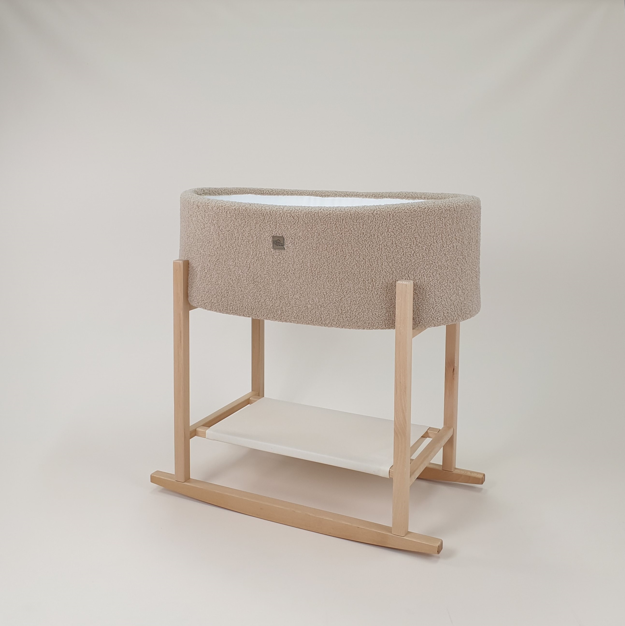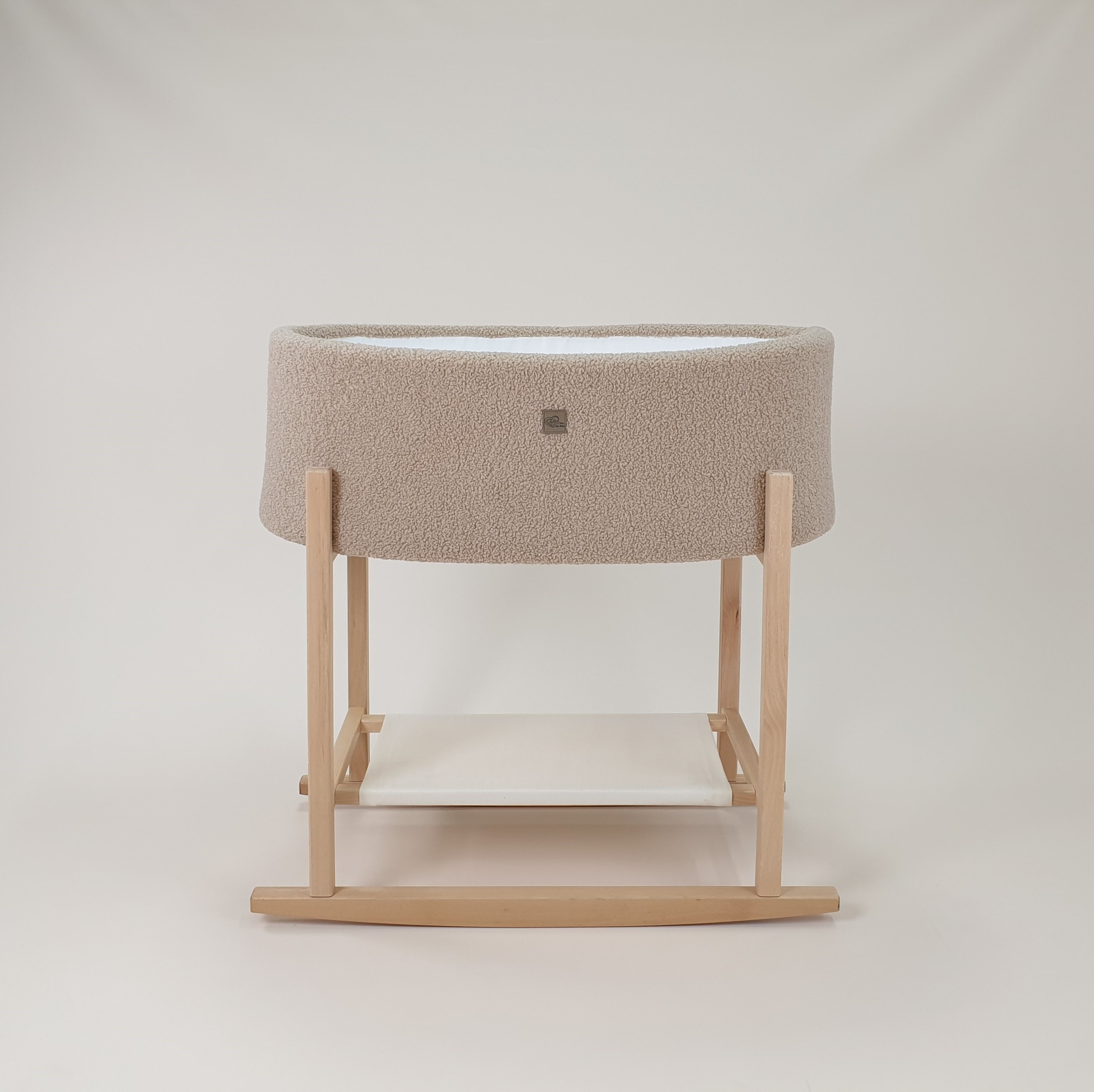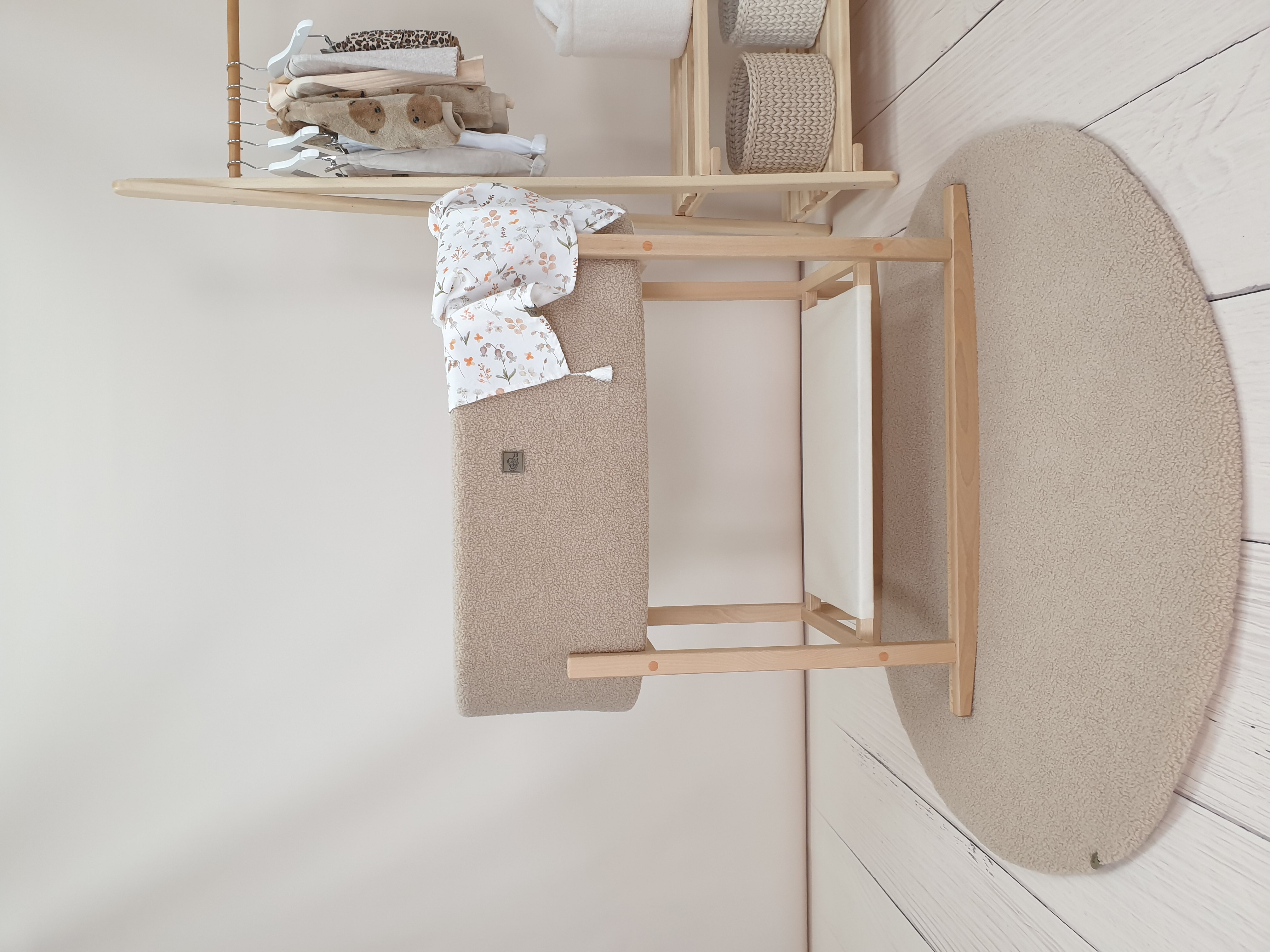 Die Innenseite des Moseskorbs ist aus weichem, weißem Baumwolljersey gefertigt, das mit Schaumstoff gepolstert ist und sanft die Form des Korbs ausfüllt. Außen ist der Moseskorb aus Teddy-Stoff (Bouclé) gearbeitet, der eine warme, kuschelige Textur bietet.
