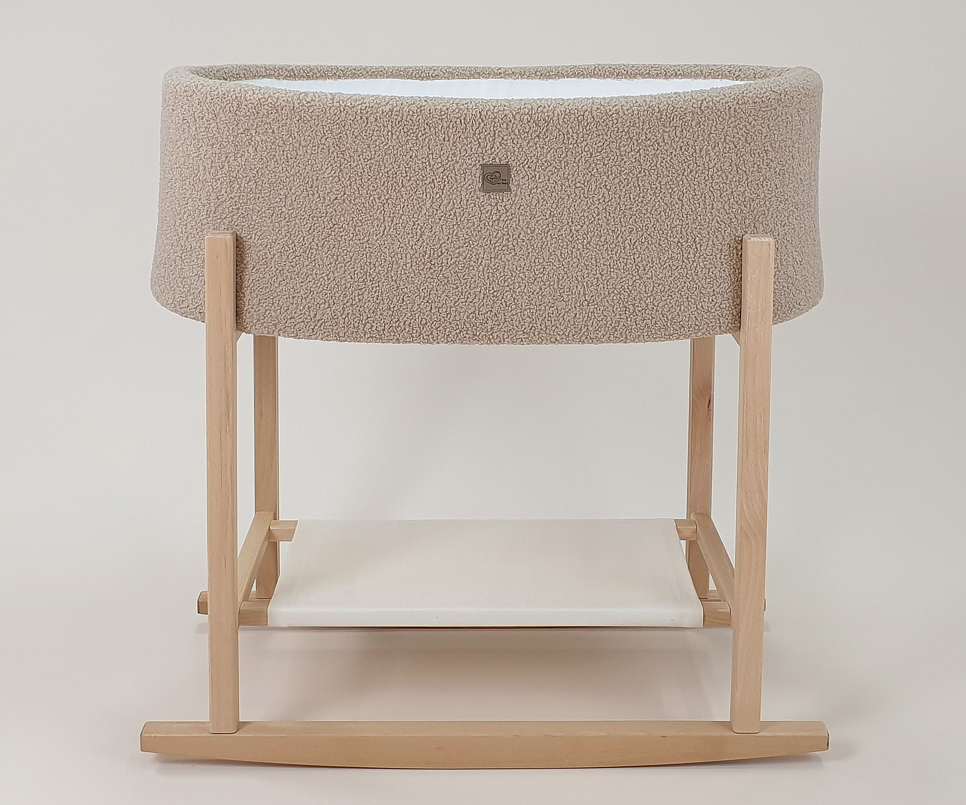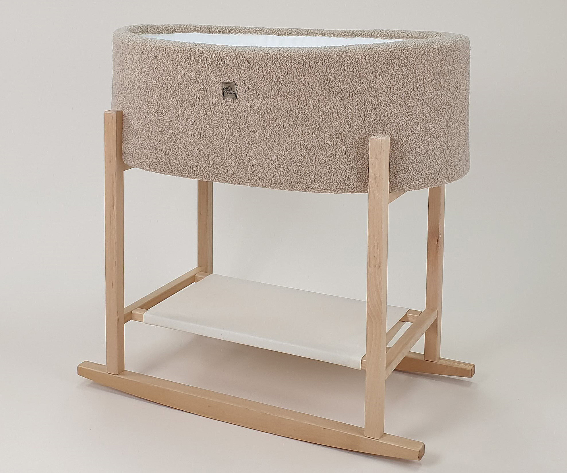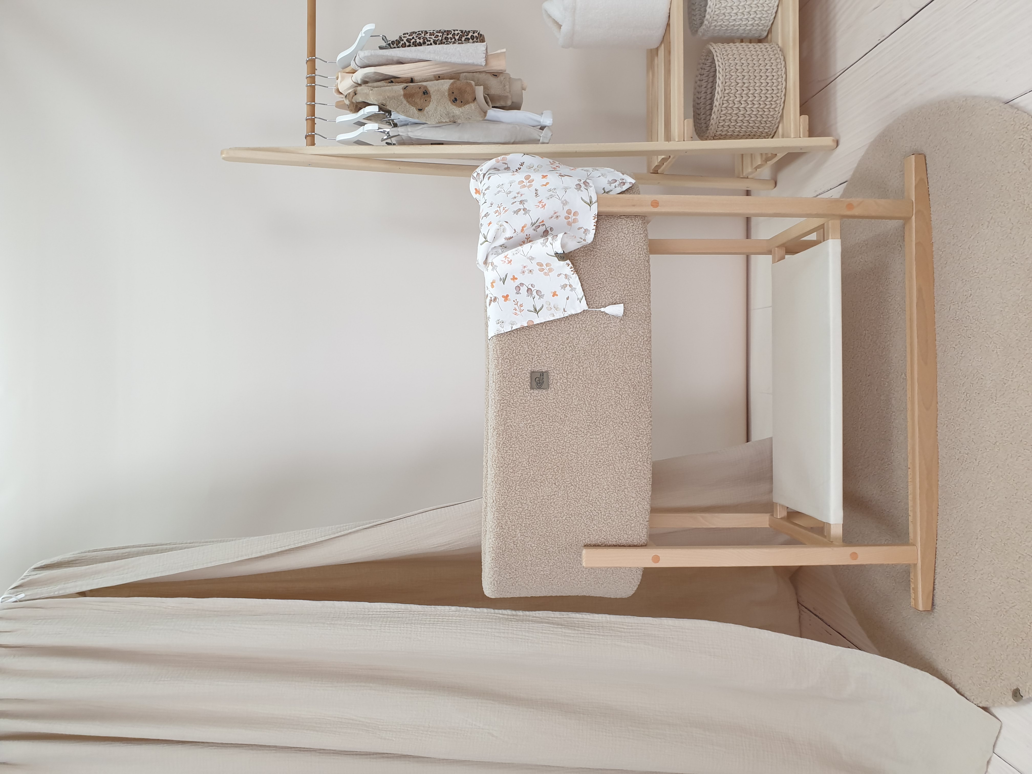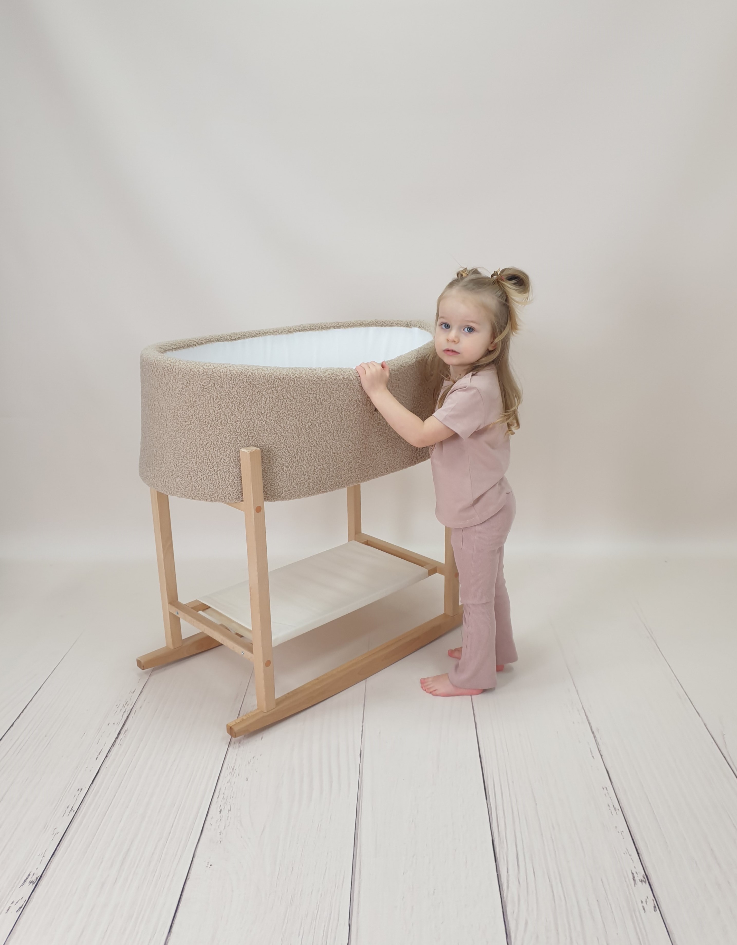 Die Innenseite des Moseskorbs ist aus weichem, weißem Baumwolljersey gefertigt, das mit Schaumstoff gepolstert ist und sanft die Form des Korbs ausfüllt. Außen ist der Moseskorb aus Teddy-Stoff (Bouclé) gearbeitet, der eine warme, kuschelige Textur bietet.