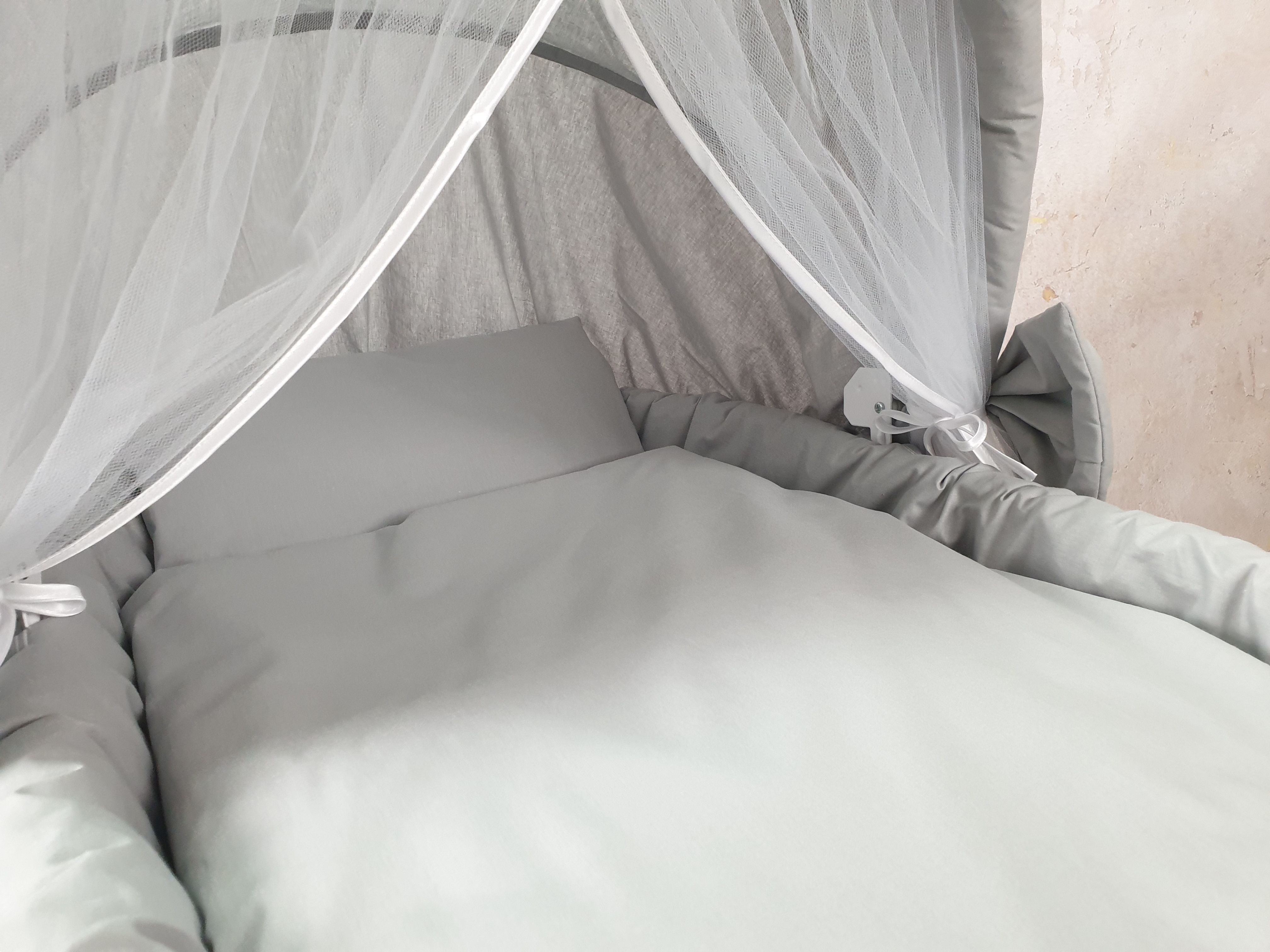 Das Set beinhaltet nicht nur den Stubenwagen, sondern auch ein komplettes Bettwäscheset aus 100% Baumwolle, bestehend aus Einlage, Kissen, Decke, Spannbettlaken und Haube mit Moskitonetz. Alle Materialien sind OEKO-TEX zertifiziert und allergiefrei.