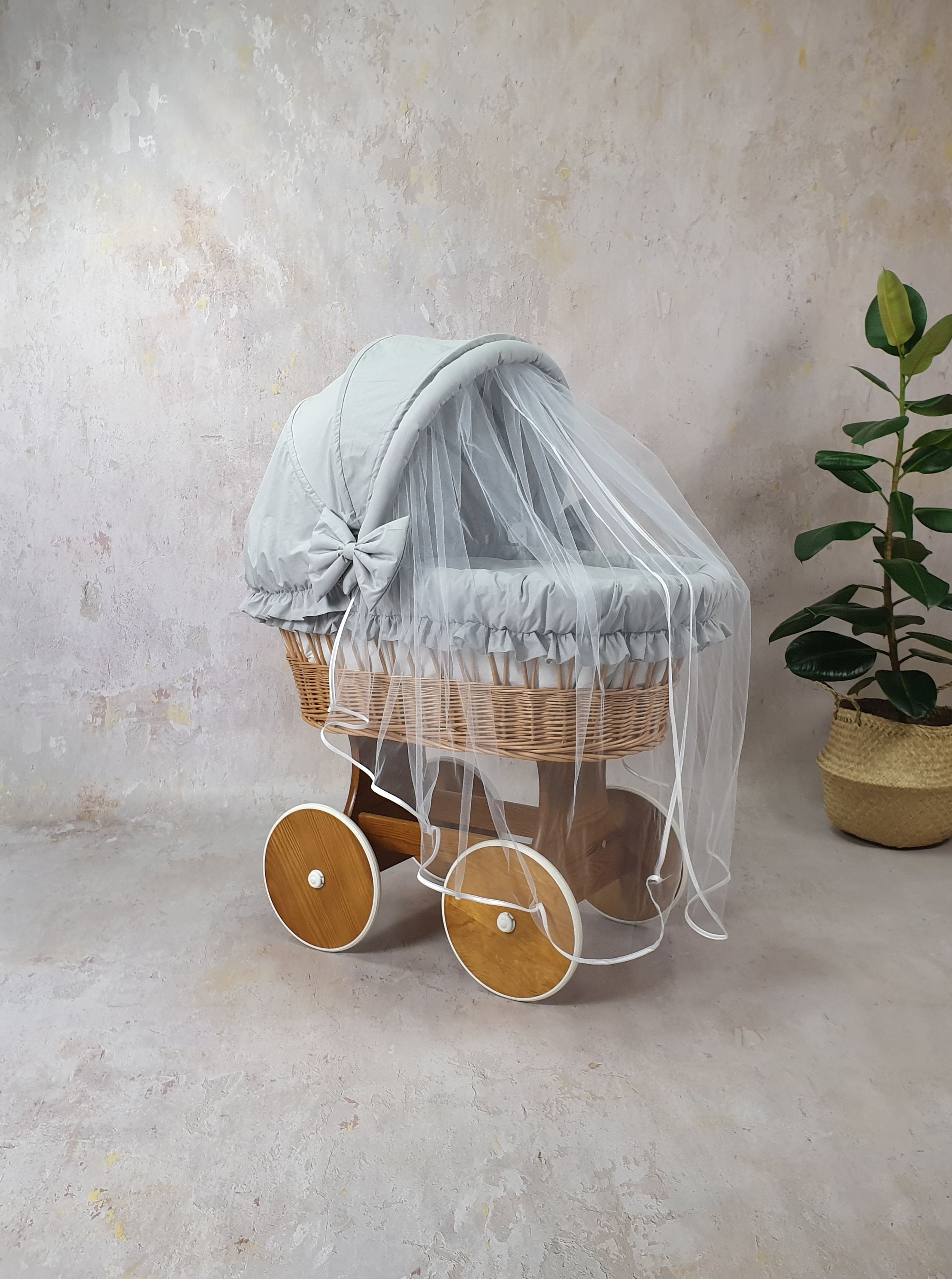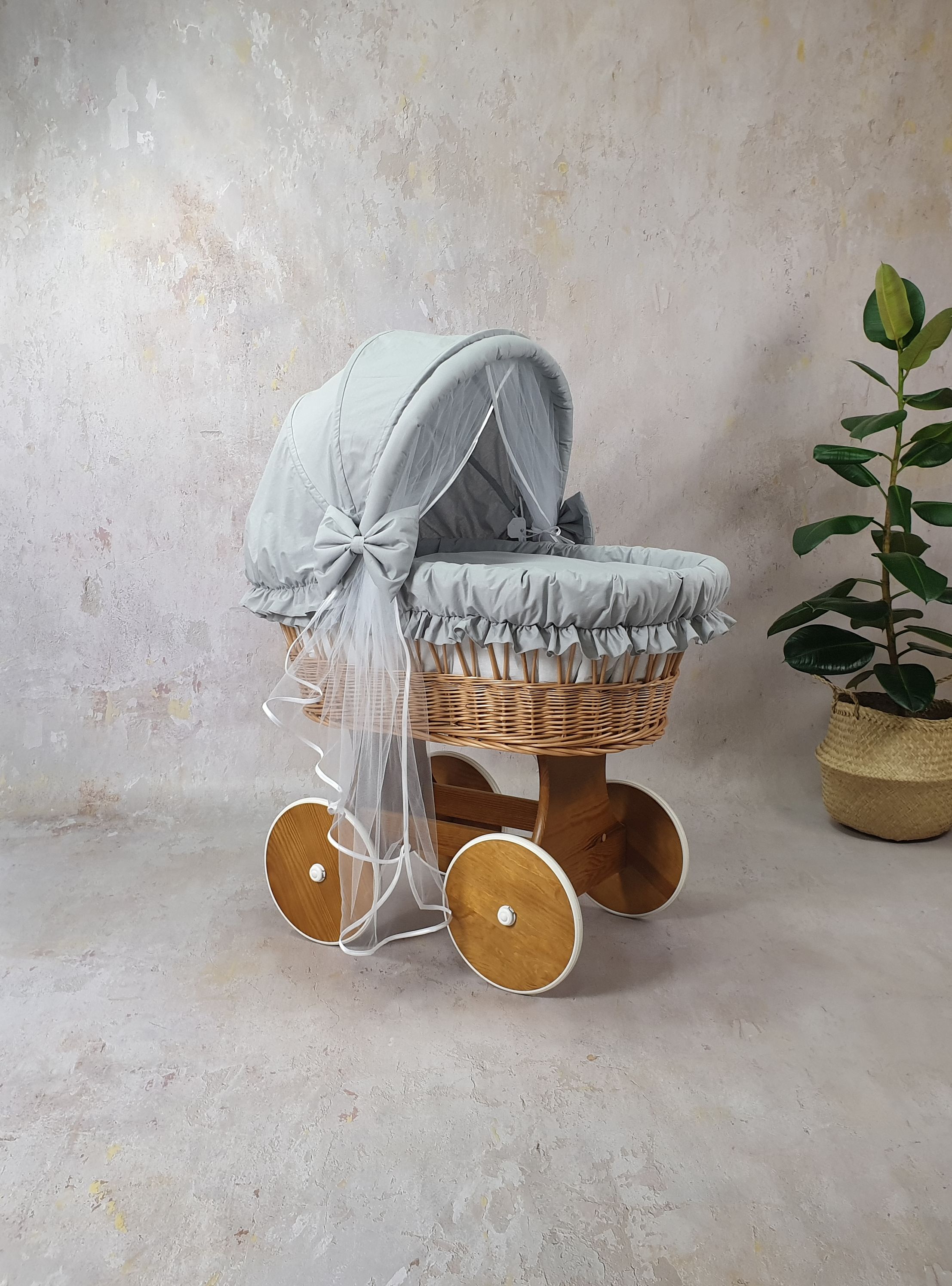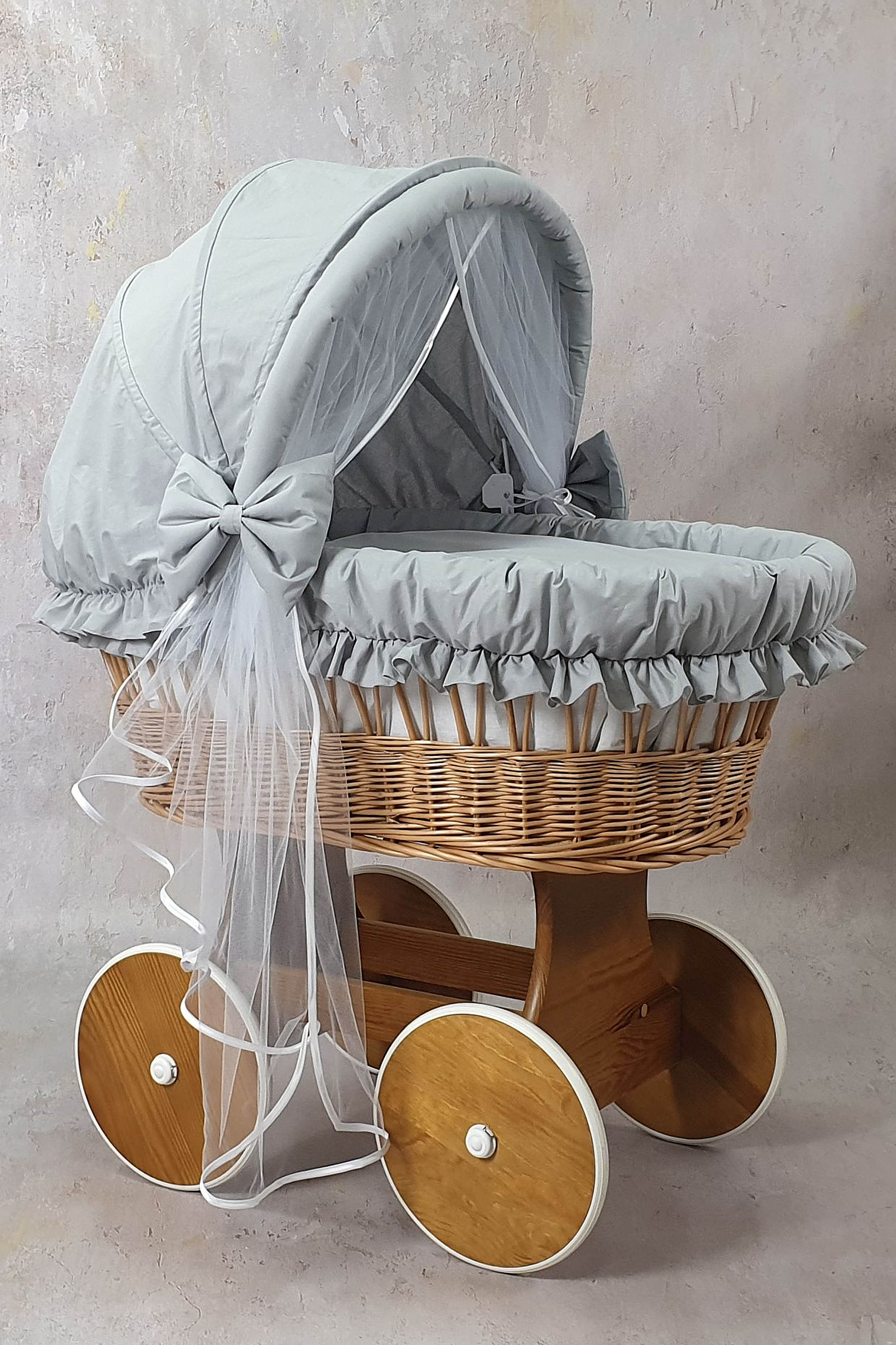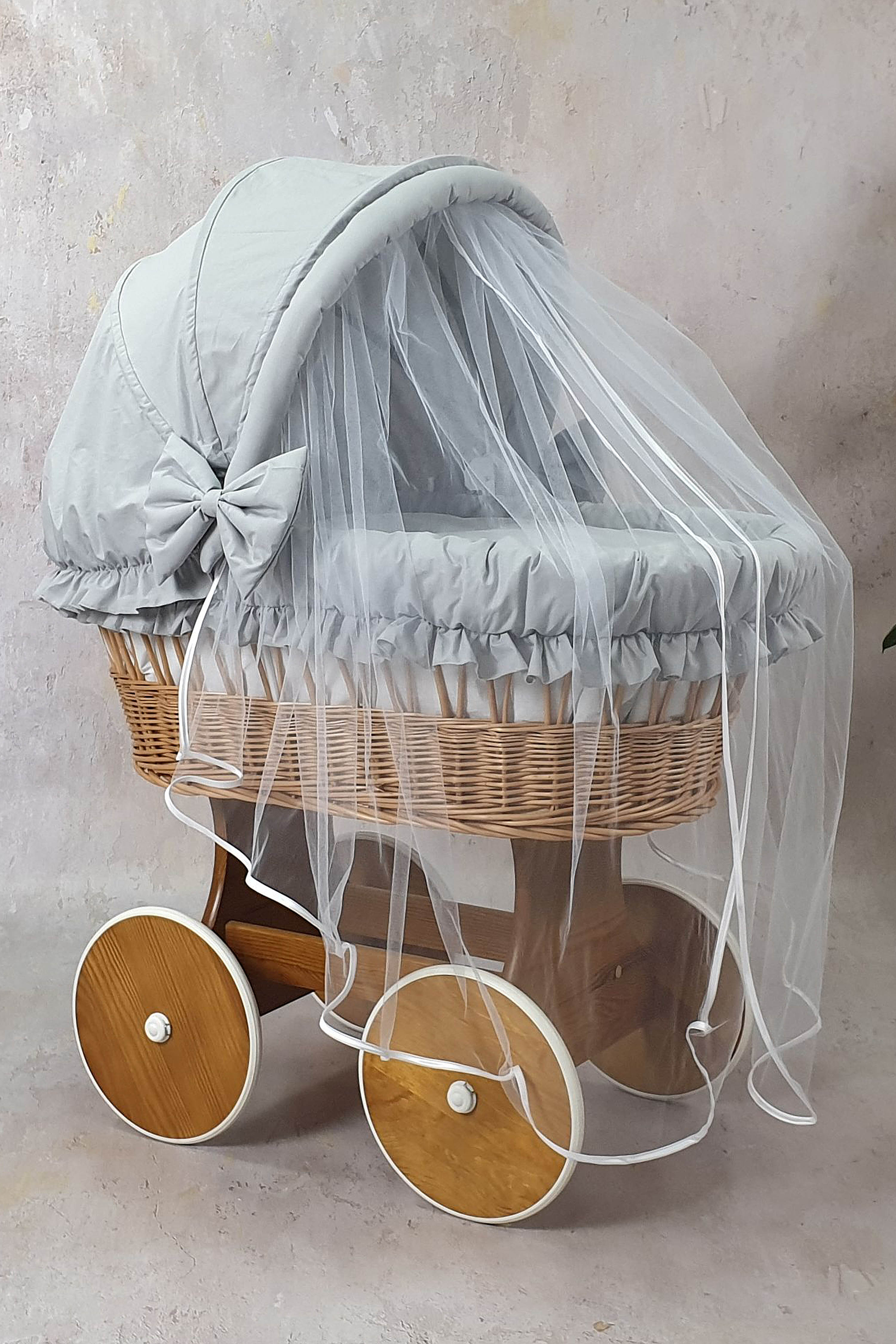 Der Satz umfasst einen Stubenwagen, bestehend aus einem Weidenkorb mit Haube mit Moskitonetz und einem Gestell mit großen Rädern, sowie einen 7-teiligen Bettwäsche-Set.