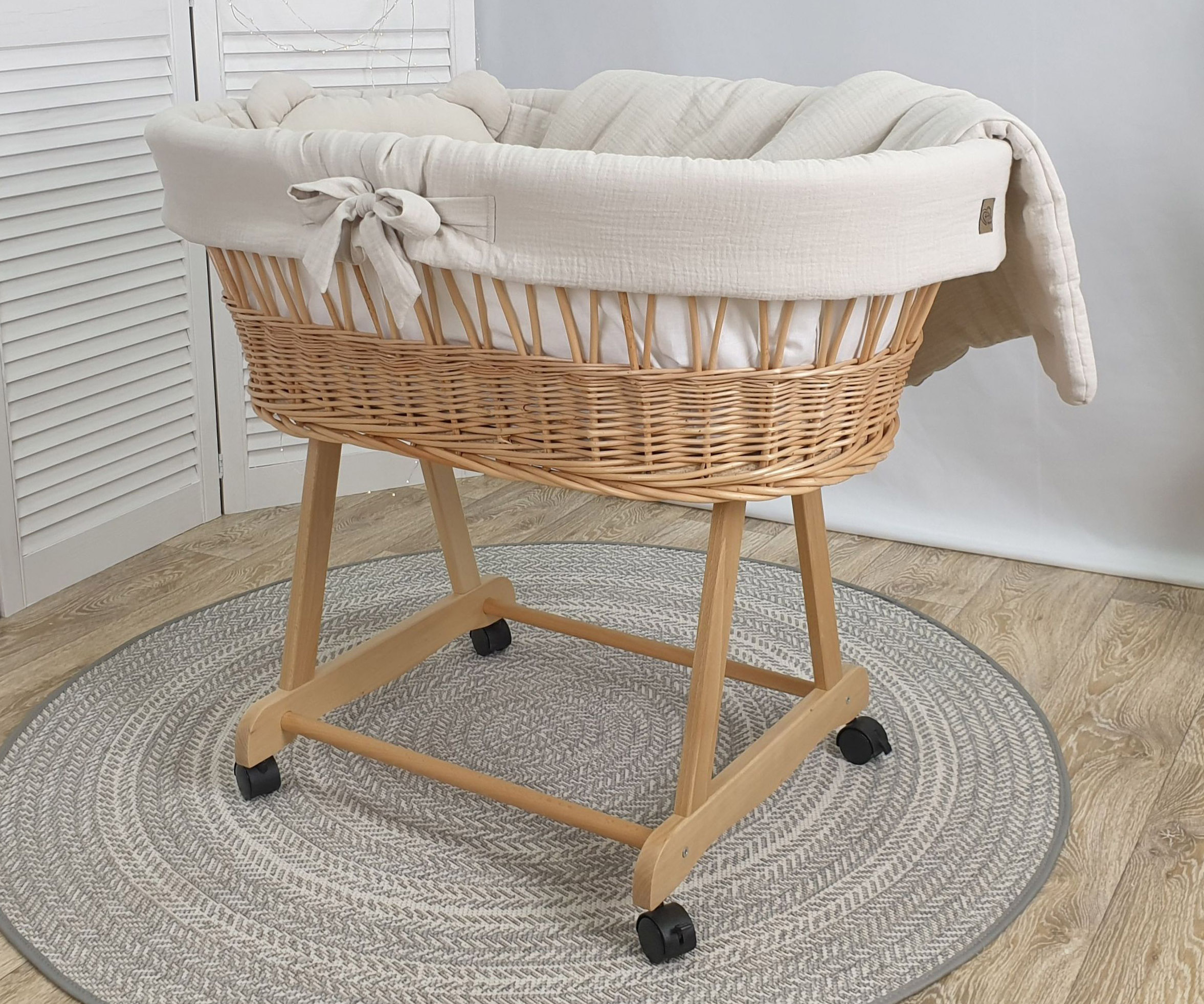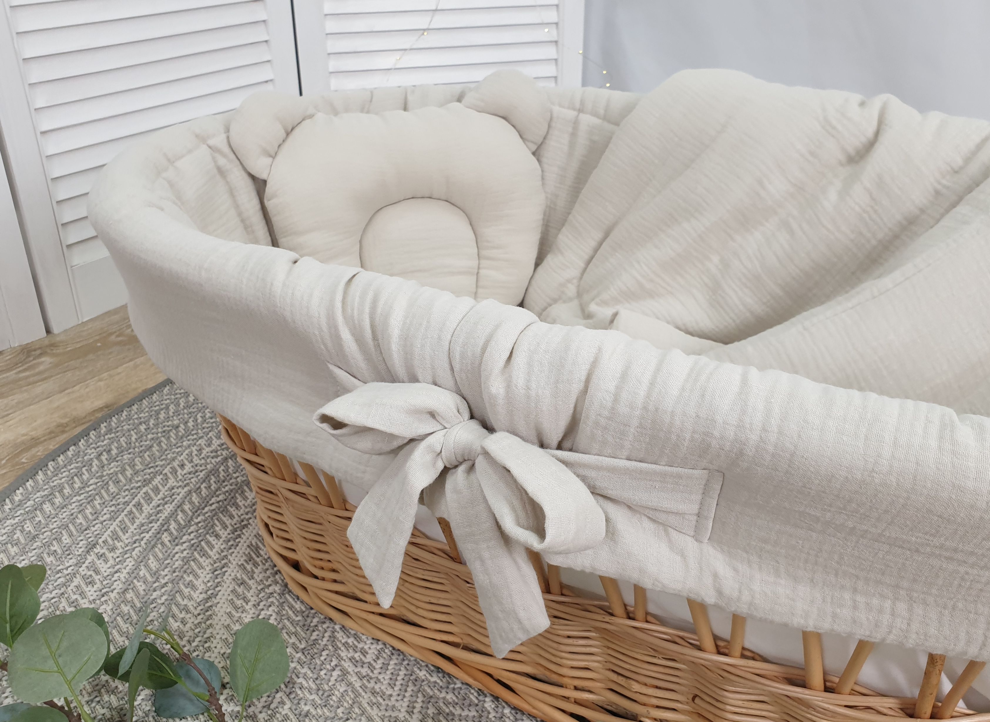 Naturweide Stubenwagen Beige Ausstattung ohne HimmelNaturfarbe Weide Stubenwagen ohne HimmelNeturweide Stubenwagen mit Bettwäsche Beige MusselinBeige Bettset für Stubenwagen ohne Himmel