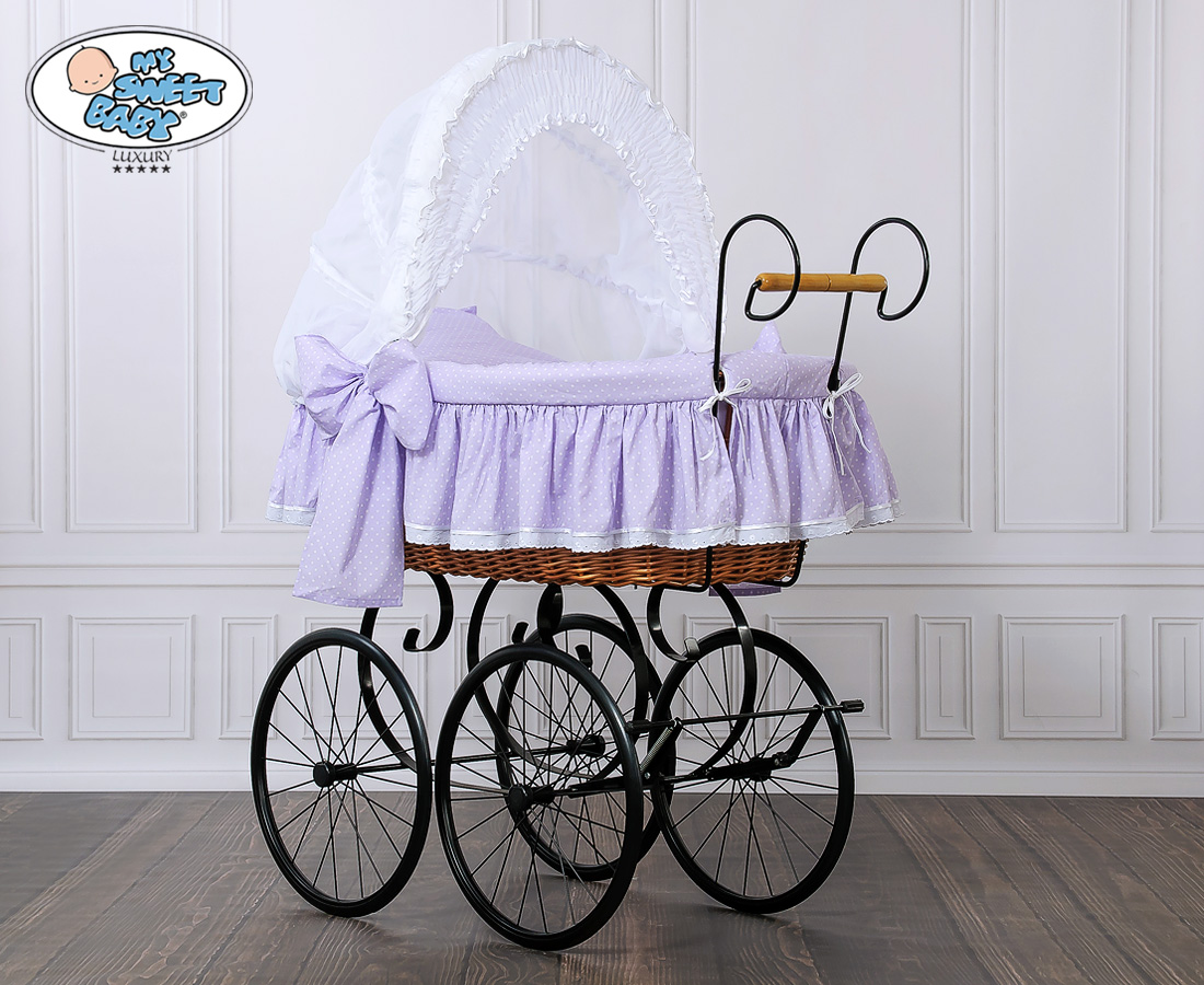Stubenwagen mit Weidenkorb mit einem Handgebogenen Untergestell in Retrostyle. Den besondern Charakter unterstreichen die Metallräder. Speichen und der Griff mit Holz. Der Korb ist Handgeflochten. Die Haube kann zugeklappt werden. Bezug ist aus 100% Baumwolle genäht. Der Korbbezug ist mit einer Vliesschicht ausgestattet, was weich ist und die Geräuche dämpft.