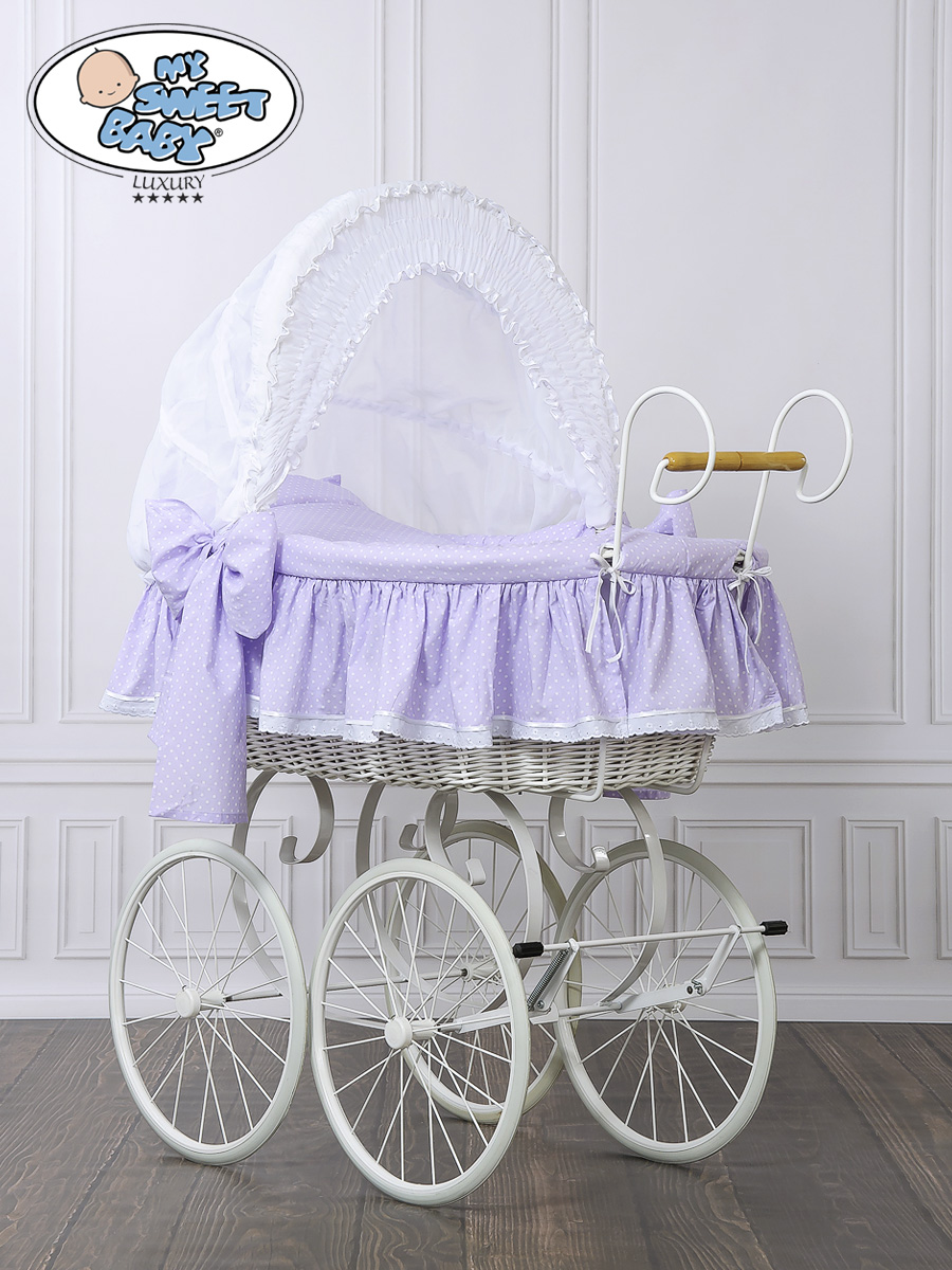 Stubenwagen mit Weidenkorb mit einem Handgebogenen Untergestell in Retrostyle. Den besondern Charakter unterstreichen die Metallräder mit Speichen und der Griff mit Holz. Der Korb ist Handgeflochten. Die Haube kann zugeklappt werden. Bezug ist aus 100% Baumwolle genäht. Der Korbbezug ist mit einer Vliesschicht ausgestattet, was weich ist und die Geräuche dämpft.