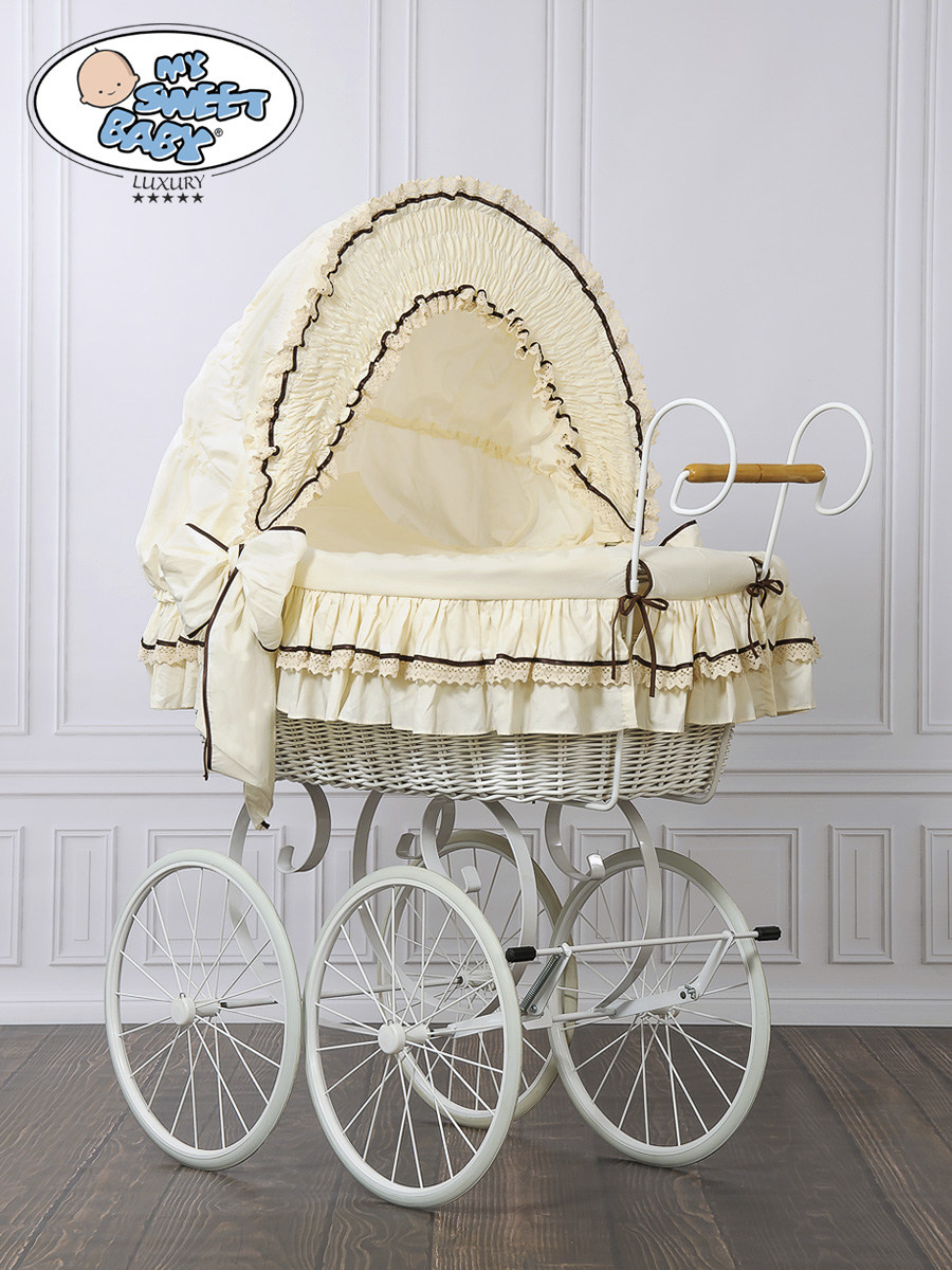 Stubenwagen mit Weidenkorb  mit einem Handgebogenen Untergestell in Retrostyle. Den besondern Charakter unterstreichen die Metallräder.  Speichen und der Griff mit Holz. Der Korb ist Handgeflochten. Die Haube kann zugeklappt werden. Bezug ist aus 100% Baumwolle genäht. Der Korbbezug ist mit einer Vliesschicht ausgestattet, was weich ist und die Geräuche dämpft.
