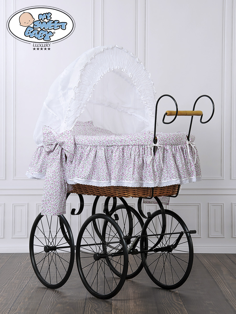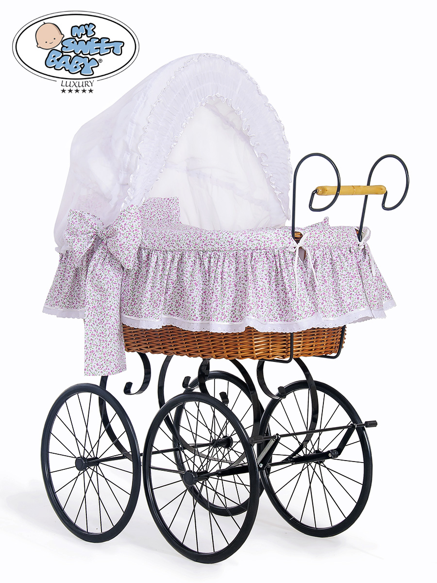 Stubenwagen mit Weidenkorb mit einem Handgebogenen Untergestell in Retrostyle. Den besondern Charakter unterstreichen die Metallräder. Speichen und der Griff mit Holz. Der Korb ist Handgeflochten. Die Haube kann zugeklappt werden. Bezug ist aus 100% Baumwolle genäht. Der Korbbezug ist mit einer Vliesschicht ausgestattet, was weich ist und die Geräuche dämpft.