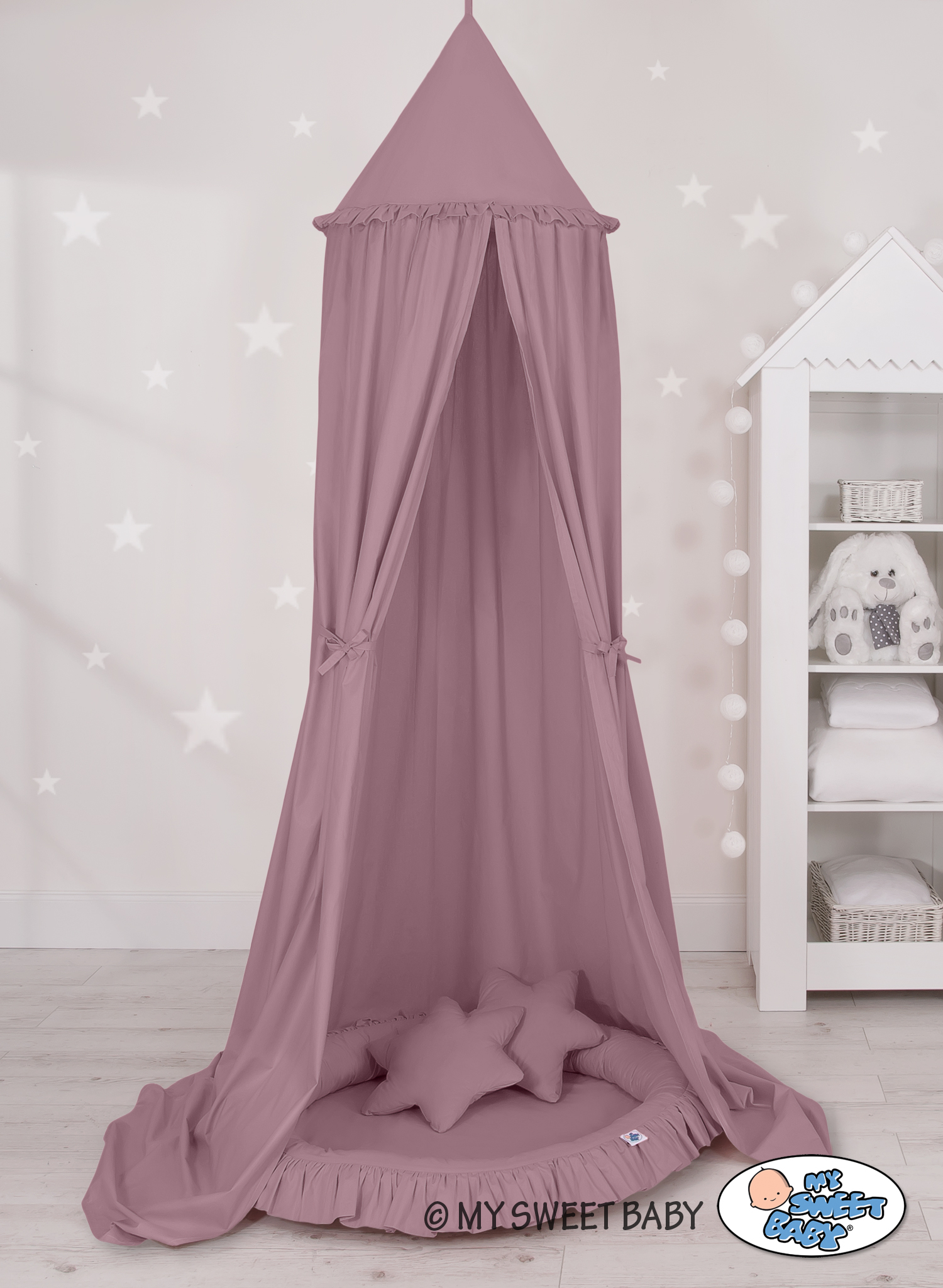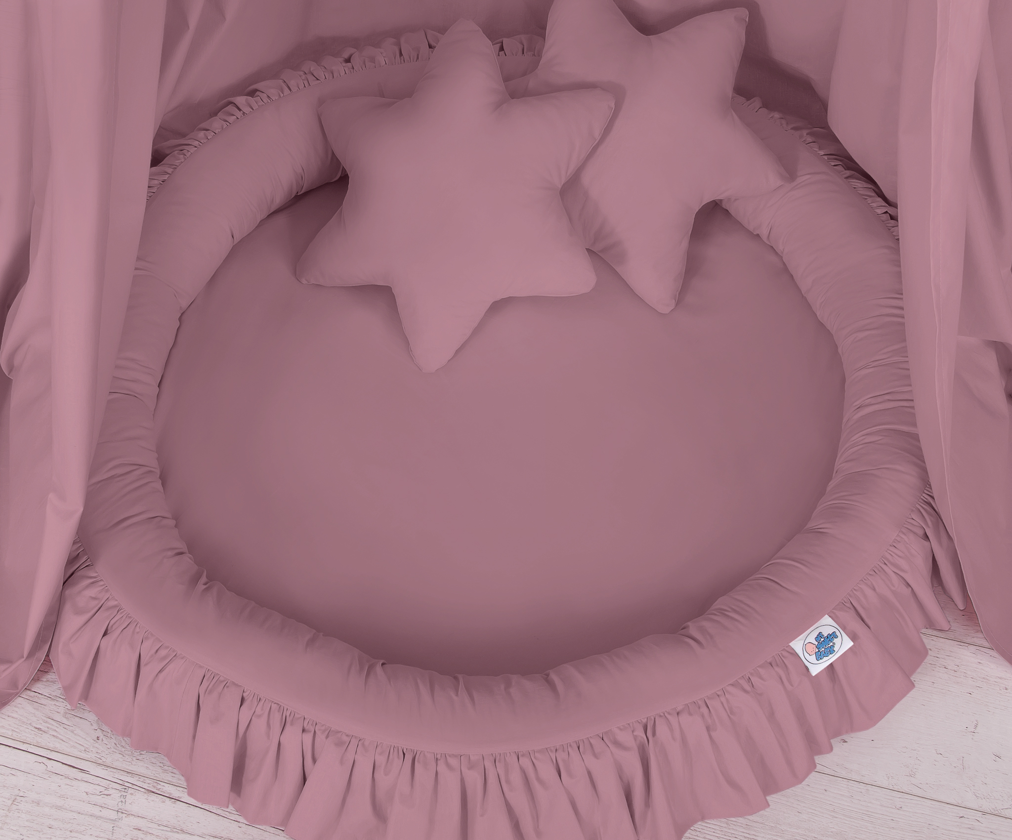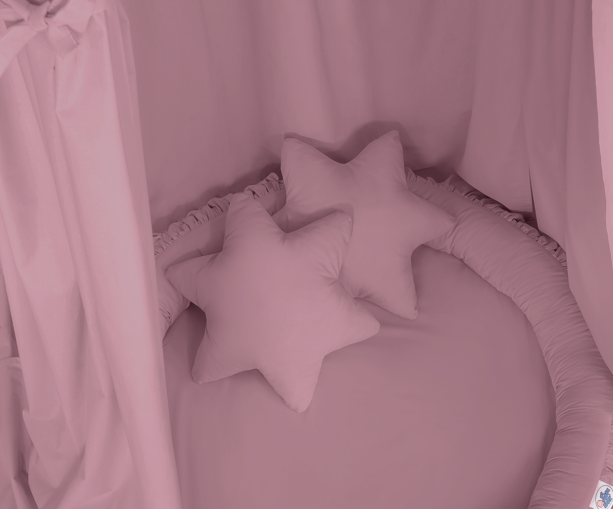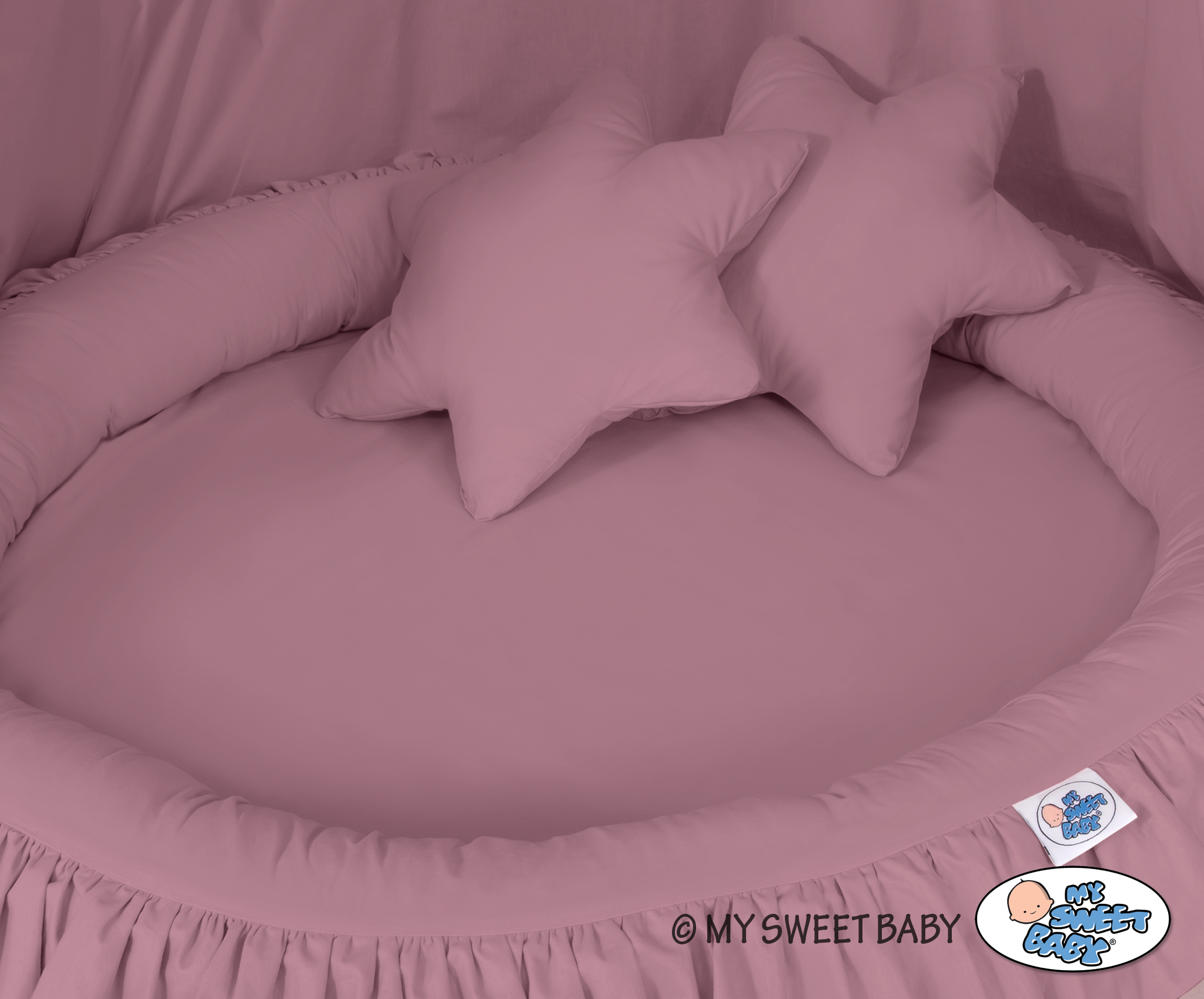 Der Betthimmel in Kombination mit weichen, bequemen Nestchen mit Rüsche schafft einen perfekten Plaz zum spielen. Die weichen Nestchenränder bieten Sicherheit für Kleinkinder. Der Bezug ist aus reiner Baumwolle mit Ökotex Zertifikat. Der Rand ist mit Eco Fillbal Gewebe gefüllt. Das Gewebe ist weich, federnd, gleichzeitig voll luftdurchlässig. Der Boden des Rüschennestchens ist mit einem weichen Inlett aus antiallergischem Gewebe ausgestattet. Das Inlett ist rausnehmbar. Der Bezug kann bei 30 Grad gewaschen werden.
