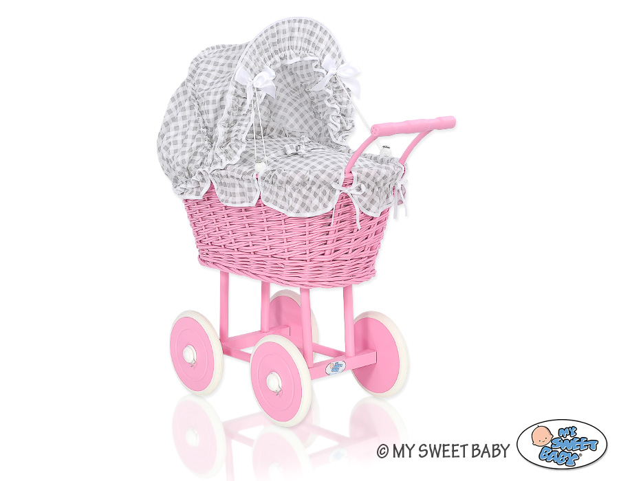 Puppenwagen aus pink WeidePink Weidenkorb Vintage PuppenwagenBettwäsche Set für Puppenwagen aus pink Weide und Holz