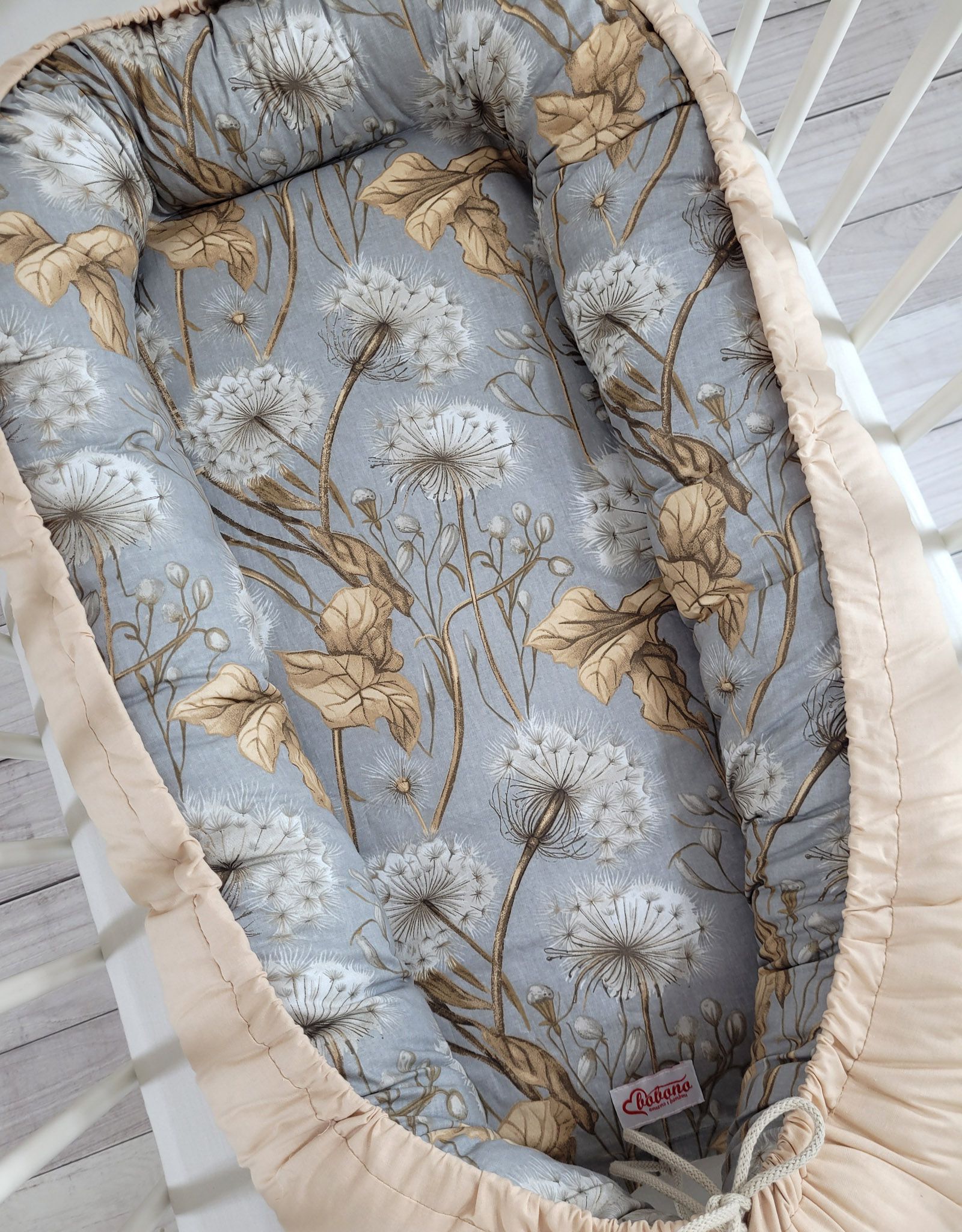 Der Kokon ist wendbar und aus hochwertigem Baumwollgewebe mit Okotex-Zertifikat hergestellt. Die Füllung des Kokons besteht aus einer speziellen zertifizierten Faser - ECO FILLBALL. Dabei handelt es sich um dünne, weiche Fasern, die zu kleinen Kugeln mit zusätzlichen Luftkanälen geformt sind. Dank einer speziellen Produktionstechnologie sind diese Bälle flauschig und federnd, gleichzeitig fühlen sie sich weich und zart wie Daunen an und sorgen für eine gute Luftzirkulation. Der Boden des Kokons ist verschlossen, so dass die Füllung zum Waschen leicht herausgenommen werden kann.