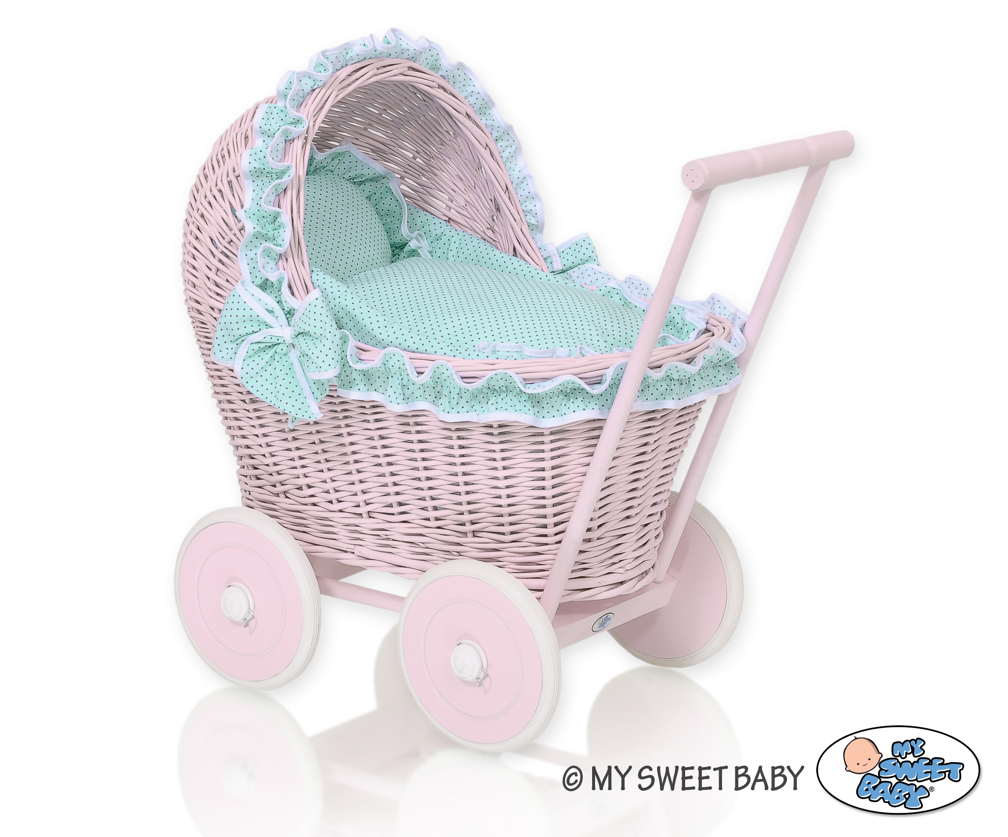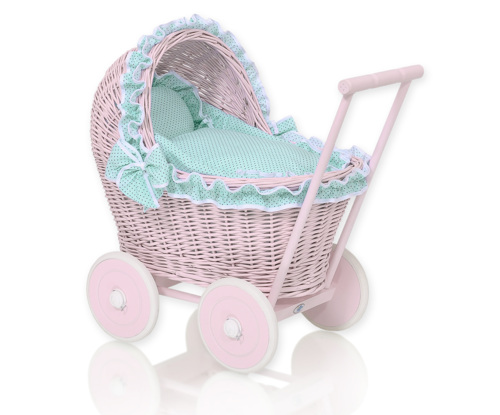 Stubenwagen » Spielzeug Kuscheltiere » Puppenwagen und Spielzeug » Puppenwagen aus Weide » Puppenwagen aus Pink Weide Bettwäsche Minze Punktmuster nr 81702-1034