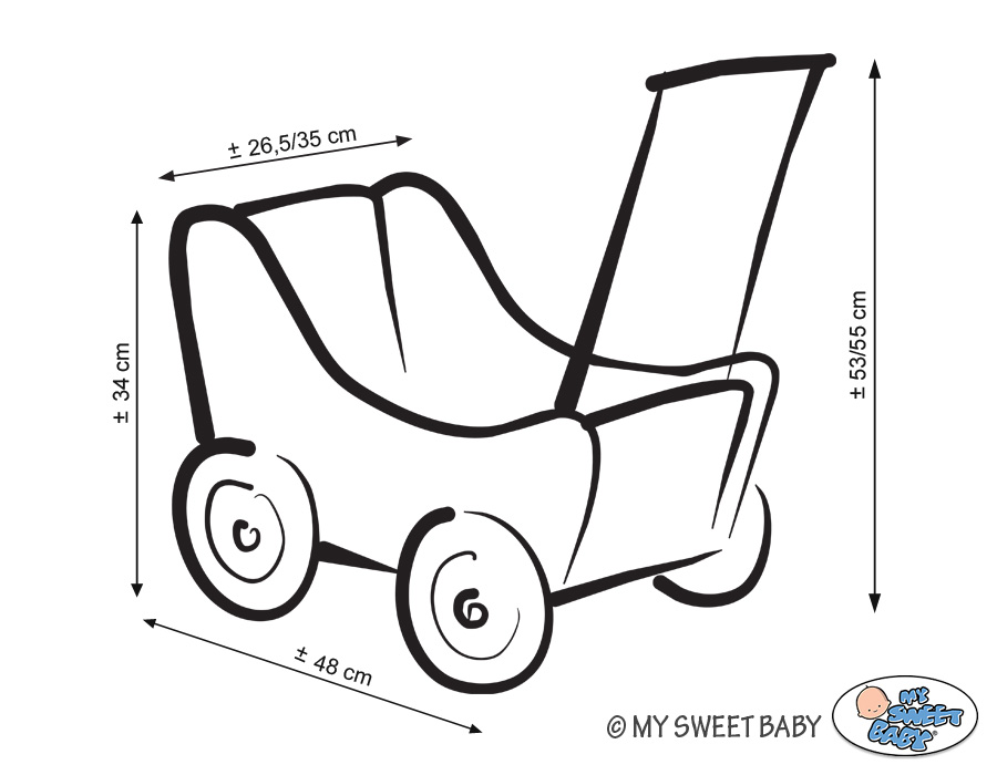 Gesamtmaße Wagen • L • 48 cm, B - 26,5 cm/35 cm mit Rädern, H • 34 cm. Handgriffhöhe • 53 cm oder 55 cm vom Boden gemessen.
