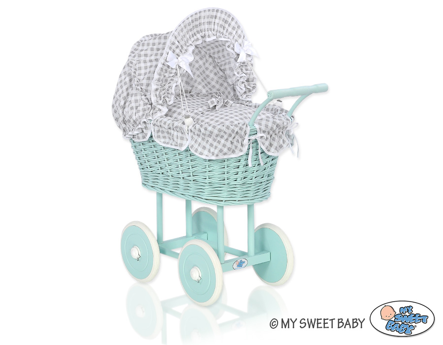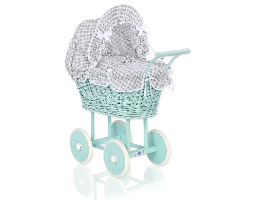 Stubenwagen » Spielzeug Kuscheltiere » Puppenwagen und Spielzeug » Puppenwagen aus Weide » Puppenwagen Minze Weidengeflecht Bettwäsche Grau Kariert nr 21699-619