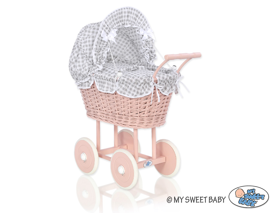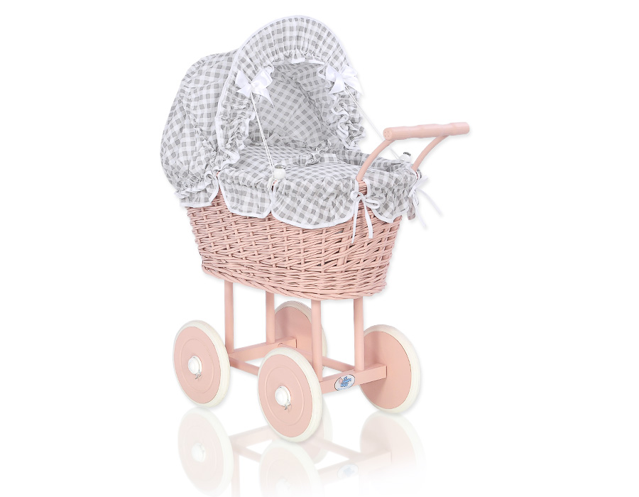 Stubenwagen » Spielzeug Kuscheltiere » Puppenwagen und Spielzeug » Puppenwagen aus Weide » Puppenwagen Puderrosa Rattan Weide Bettwäsche Grau Kariert nr 11699-619