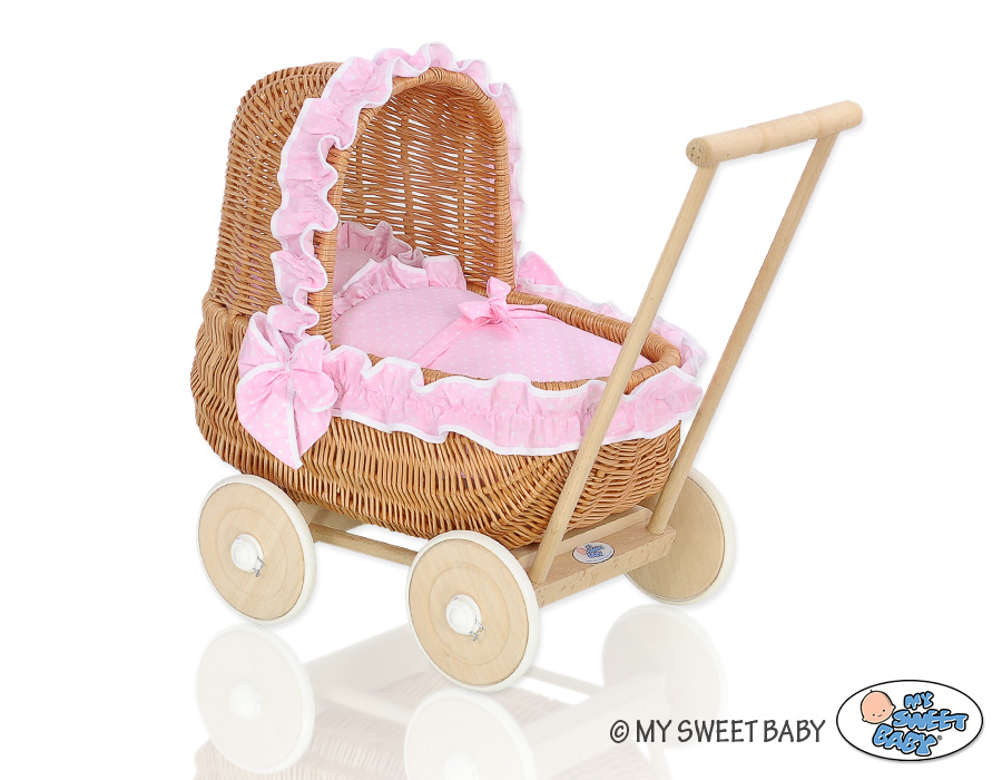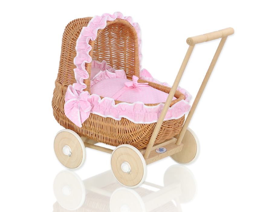 Eine wunderbare Geschenkidee für alle kleinen Mädchen. Sowohl der Korb aus Weide, als auch das Holzuntergestell entstehen in Handarbeit. Die Retropuppenwagen sind in vielen wunderschönen Farben verfügbar. Die sanften Pastelltöne des Puppenwagens ergeben eine wunderschöne Kombination mit den verschiedenen Farben der Bezüge. Dadurch sind unsere Puppenwagen wunderschönes Spielzeug und ein richtiges Hingucker.