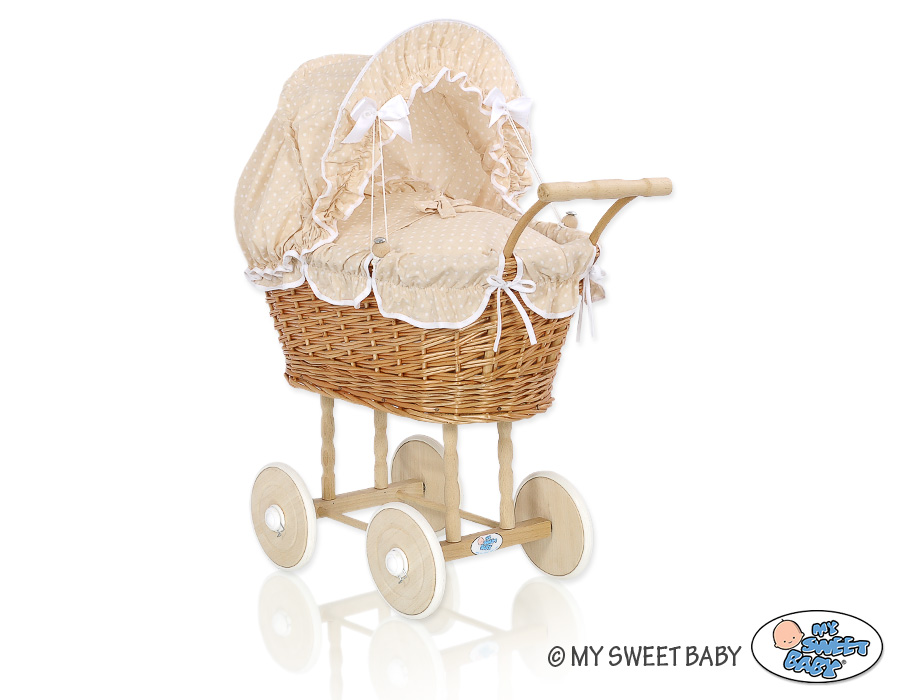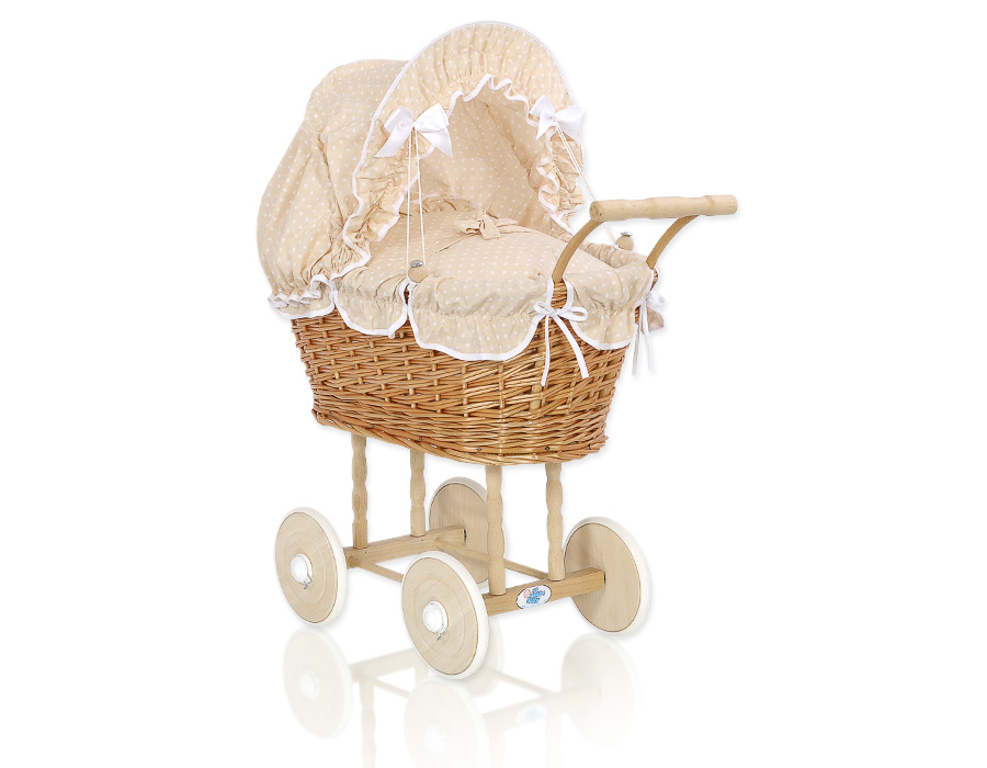 Stubenwagen » Spielzeug Kuscheltiere » Puppenwagen und Spielzeug » Puppenwagen aus Weide » Puppenwagen Weide Bettwäsche Beige mit Weiß Punktmuster nr 1699-529
