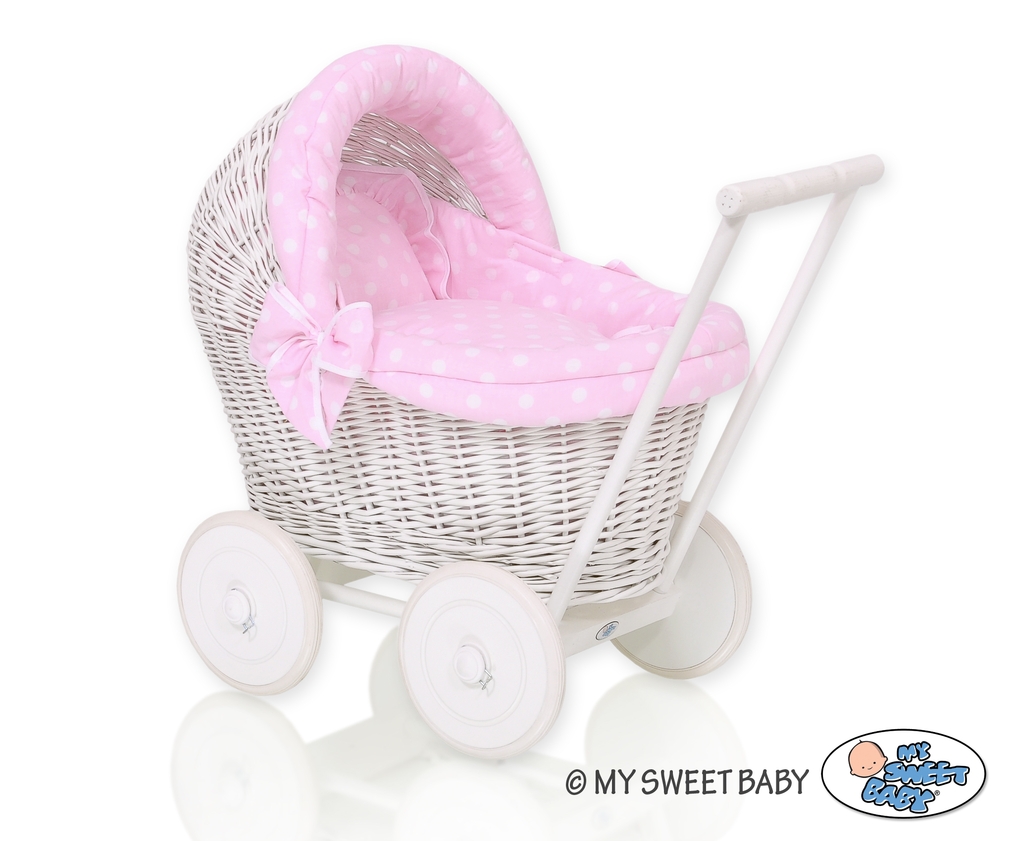 Stubenwagen » Spielzeug Kuscheltiere » Puppenwagen und Spielzeug » Puppenwagen aus Weide » Puppenwagen Weiße Weide Bettwäsche Rosa Punktmuster nr 71703-553