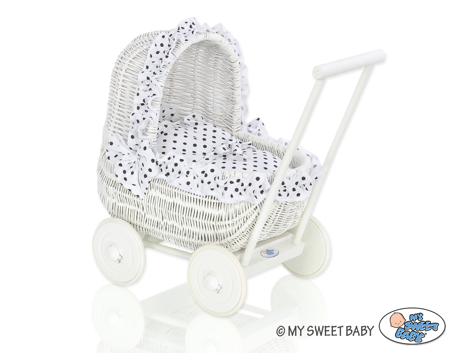 Stubenwagen » Spielzeug Kuscheltiere » Puppenwagen und Spielzeug » Puppenwagen aus Weide » Puppenwagen Weiße Weide Bettwäsche Weiß mit Schwarz Punktemuster nr 71699-738