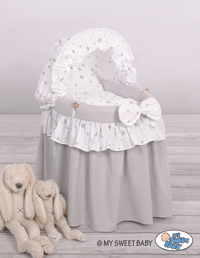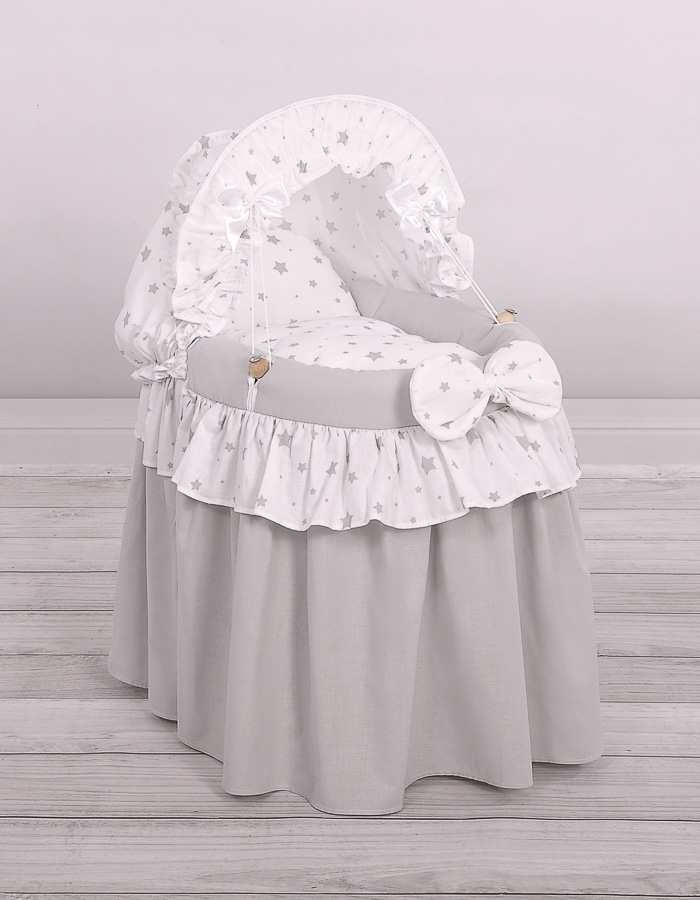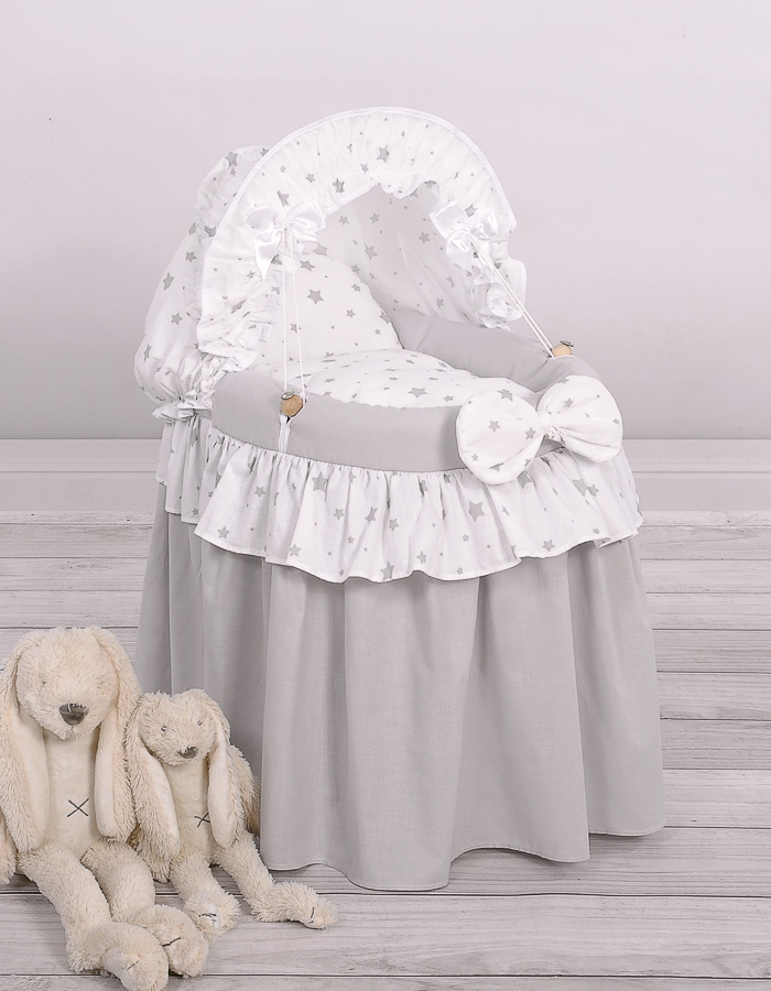 Sowohl der Korb aus Weide, als auch das Holzuntergestell entstehen in Handarbeit. Bezug aus 100% Baumwolle mit decorativen Rüschen.