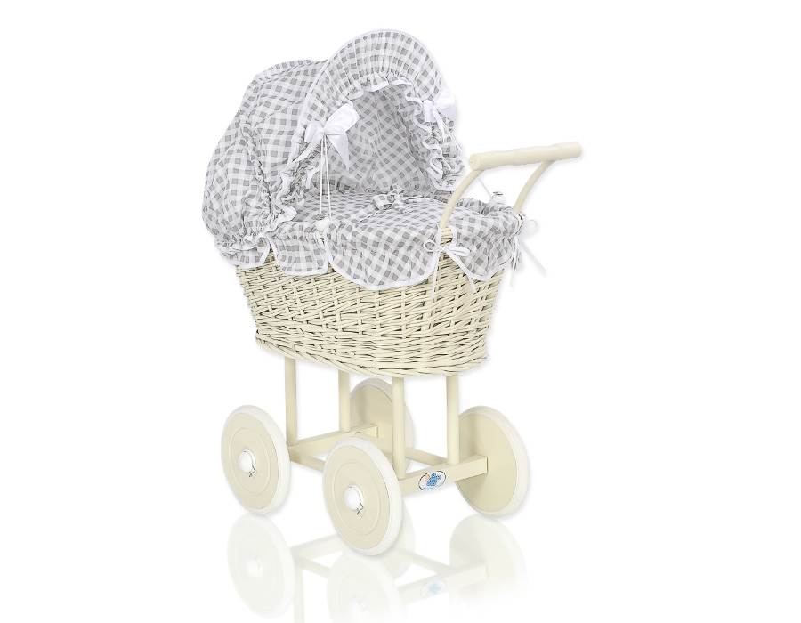 Stubenwagen » Spielzeug Kuscheltiere » Puppenwagen und Spielzeug » Puppenwagen aus Weide » Retro Puppenwagen Weidengeflecht Bettwäsche Grau Kariert nr 101699-619