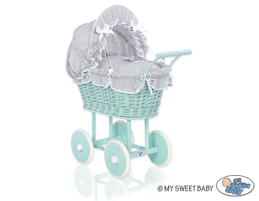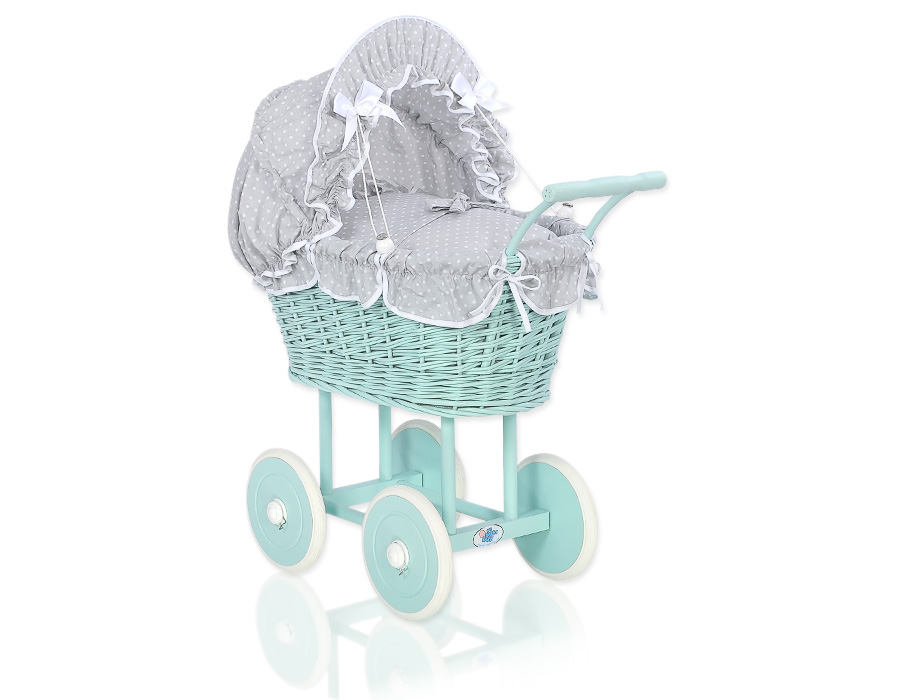 Stubenwagen » Spielzeug Kuscheltiere » Puppenwagen und Spielzeug » Puppenwagen aus Weide » Retropuppenwagen Minze Weidengeflecht Bettwäsche Grau mit Weiß Punktmuster nr 21699-535