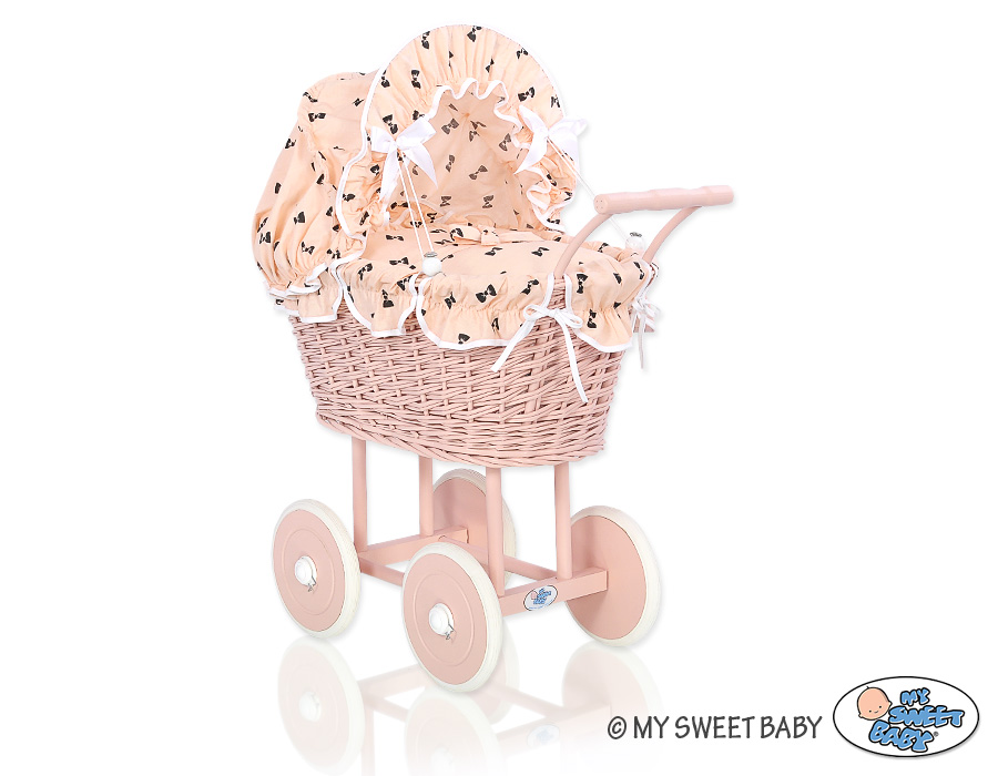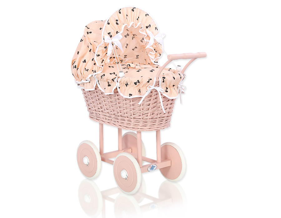Stubenwagen » Spielzeug Kuscheltiere » Puppenwagen und Spielzeug » Puppenwagen aus Weide » Retropuppenwagen Rattan Puderrosa Holz Bettwäsche Schleifenmuster nr 11699-762