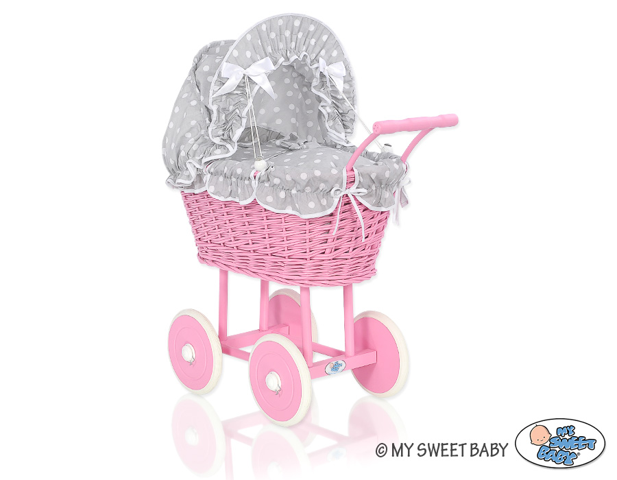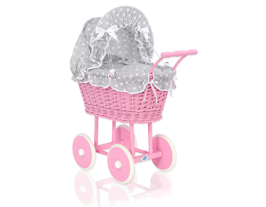 Stubenwagen » Spielzeug Kuscheltiere » Puppenwagen und Spielzeug » Puppenwagen aus Weide » Rosa Weide Puppenwagen Bettwäsche Grau mit Weiß Punktmuster nr 51699-583
