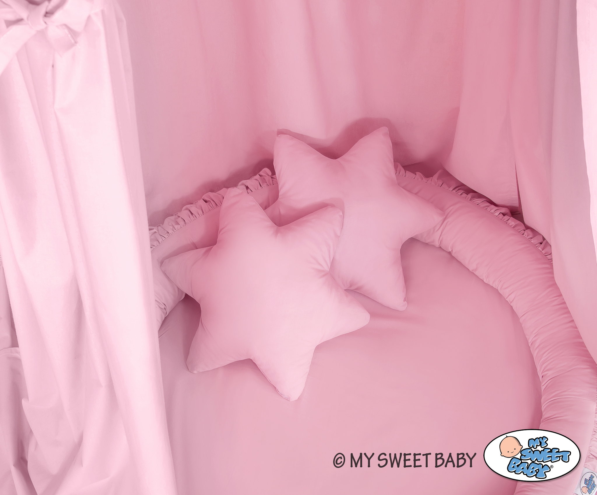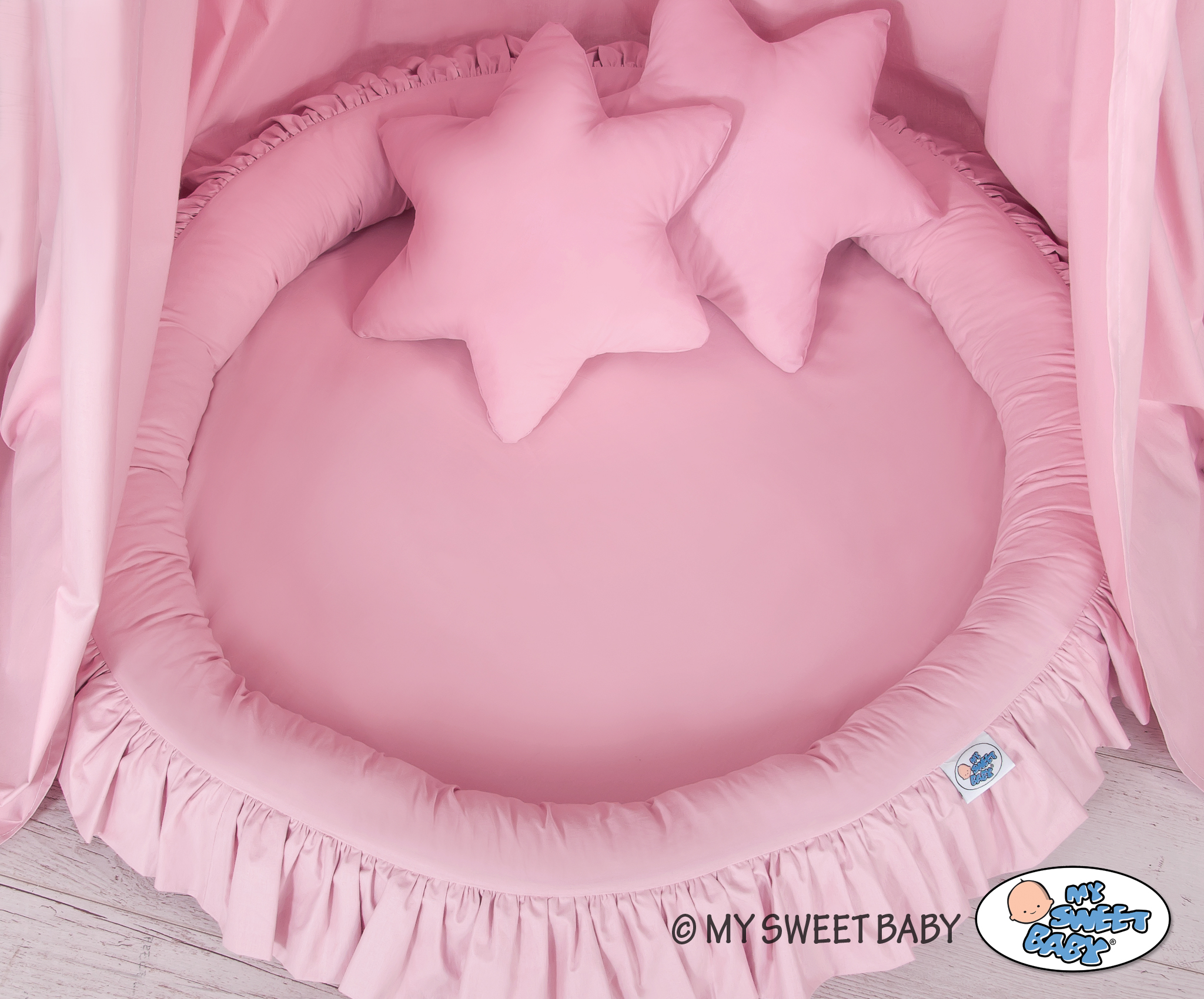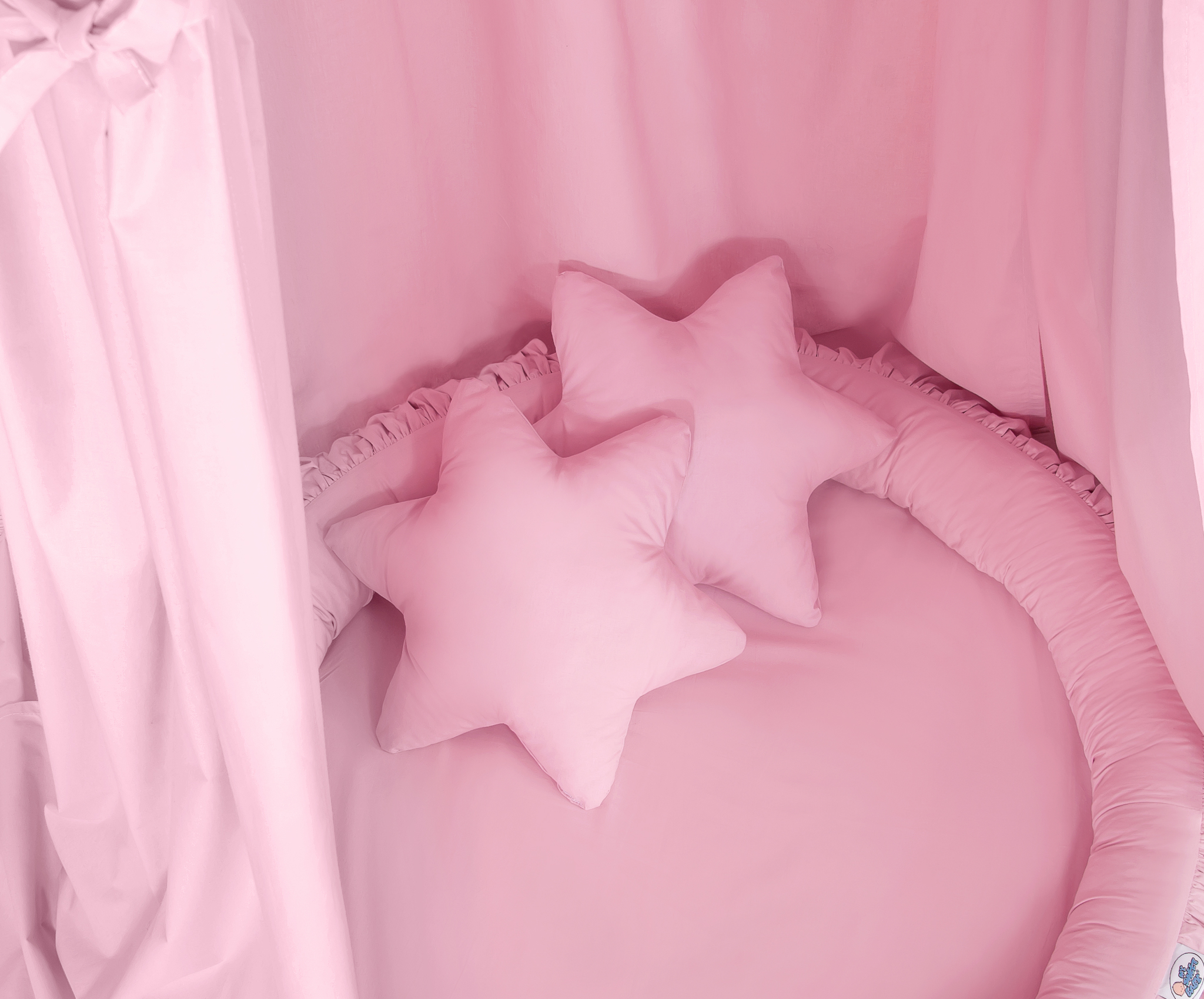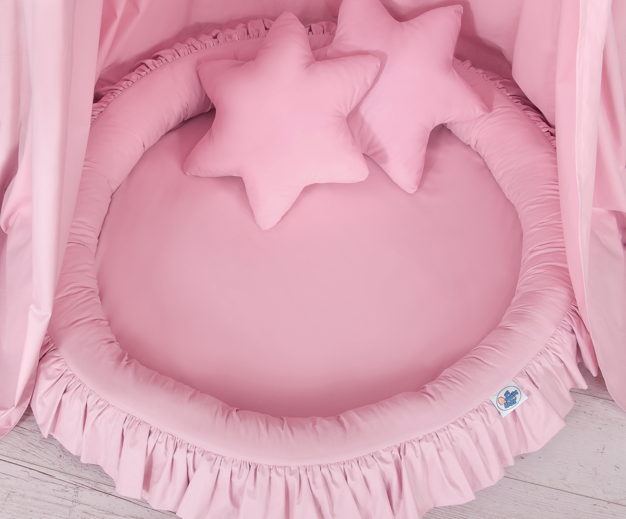 Der Betthimmel in Kombination mit weichen, bequemen Nestchen mit Rüsche schafft einen perfekten Plaz zum spielen. Die weichen Nestchenränder bieten Sicherheit für Kleinkinder. Der Bezug ist aus reiner Baumwolle mit Ökotex Zertifikat. Der Rand ist mit Eco Fillbal Gewebe gefüllt. Das Gewebe ist weich, federnd, gleichzeitig voll luftdurchlässig. Der Boden des Rüschennestchens ist mit einem weichen Inlett aus antiallergischem Gewebe ausgestattet. Das Inlett ist rausnehmbar. Der Bezug kann bei 30 Grad gewaschen werden.