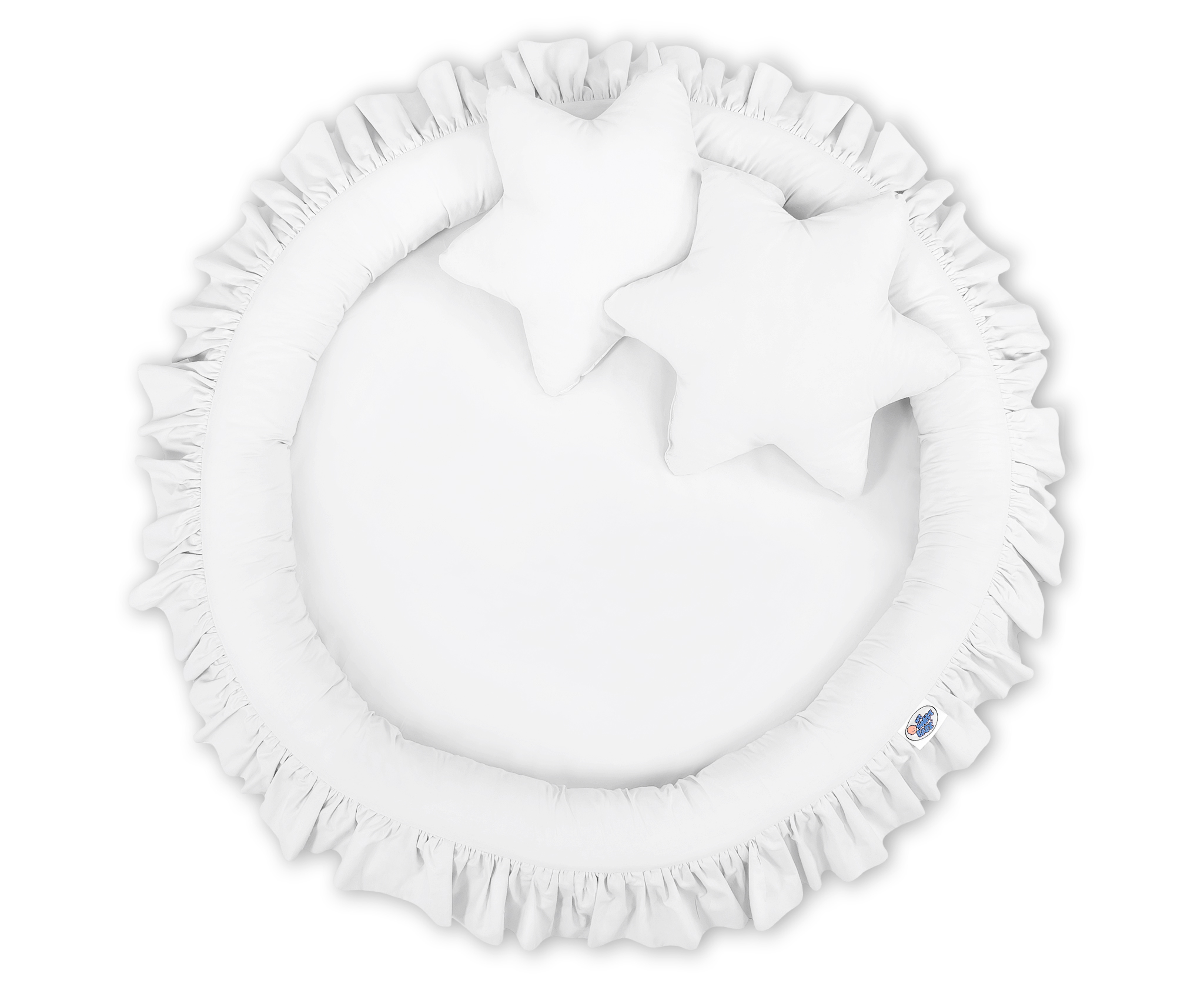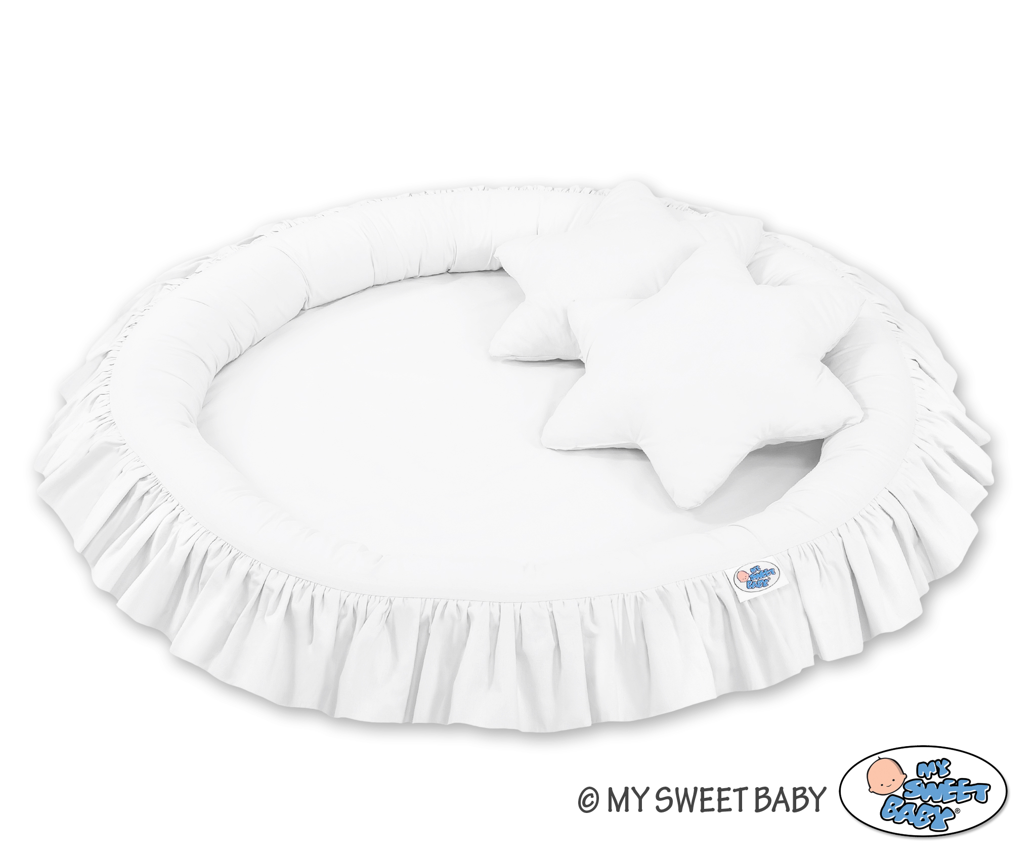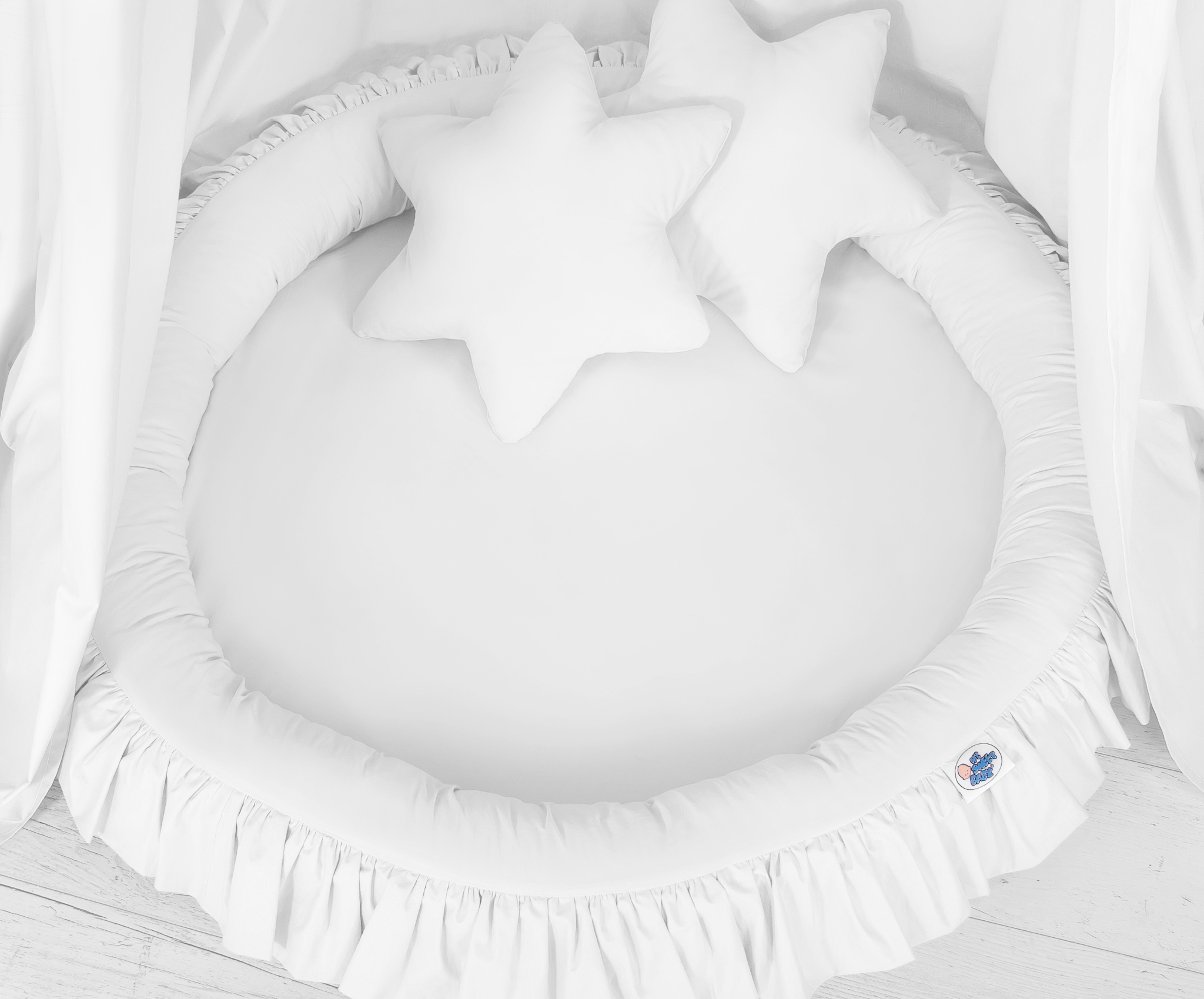 Der Betthimmel in Kombination mit weichen, bequemen Nestchen mit Rüsche schafft einen perfekten Plaz zum spielen. Die weichen Nestchenränder bieten Sicherheit für Kleinkinder. Der Bezug ist aus reiner Baumwolle mit Ökotex Zertifikat. Der Rand ist mit Eco Fillbal Gewebe gefüllt. Das Gewebe ist weich, federnd, gleichzeitig voll luftdurchlässig. Der Boden des Rüschennestchens ist mit einem weichen Inlett aus antiallergischem Gewebe ausgestattet. Das Inlett ist rausnehmbar. Der Bezug kann bei 30 Grad gewaschen werden.