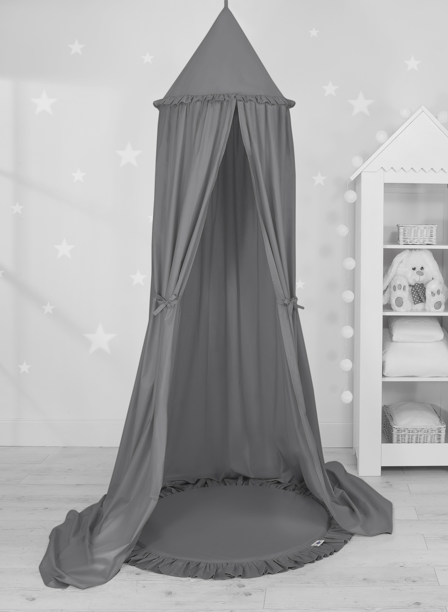 Ein effektvoller Hängehimmel für das Kinderzimmer. Unser Himmel kann als außergewöhnliche Dekoration, oder auch als ein gemütliches Spielplätzchen dienen. Über dem Kinderbett aufgehängt schützt der Himmel vor zu viel Licht und dämmt die Geräusche, so dass ein gemütlicher Ruheplatz entsteht. Der Himmel kann auch separat leicht an die Decke angebracht werden. Die Länge von 260 cm erlaubt die Enden am Boden zu drapieren. Somit entsteht ein Versteck und Spielplatz für ältere Kinder.