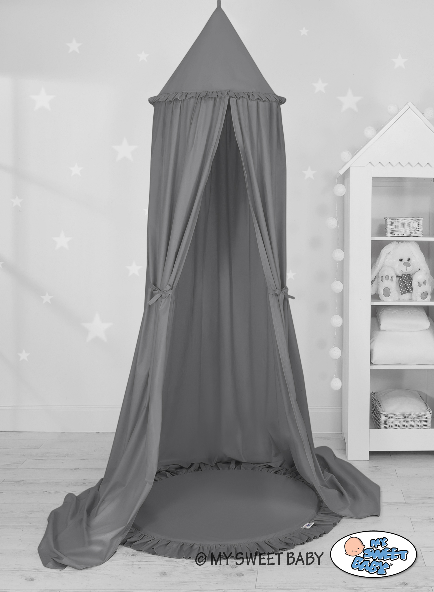 Der Himmelstoff besteht aus sicheren, 100% Baumwolle mit Ökotex Zertifikat. An den Seiten sind praktische Bändchen angenäht. Sie erlauben den Stoff je nach Bedarf oder Idee zusammen zu binden. Der Ring oben kann abgenommen werden. Der Himmelstoff ist bei 30 Grad waschbar. Der Betthimmel in Kombination mit weichen, bequemen Bodenmatte schafft einen perfekten Plaz zum spielen. Die Bodenmatte schützt vor Kälte und ist angenehm weich. Die Einlage kann aus der Spielmatte herausgenommen werden und der Bezug gewaschen werden. Der Spielmattenbezug ist aus reiner Baumwolle mit Ökotex Zertifikat hergestellt.