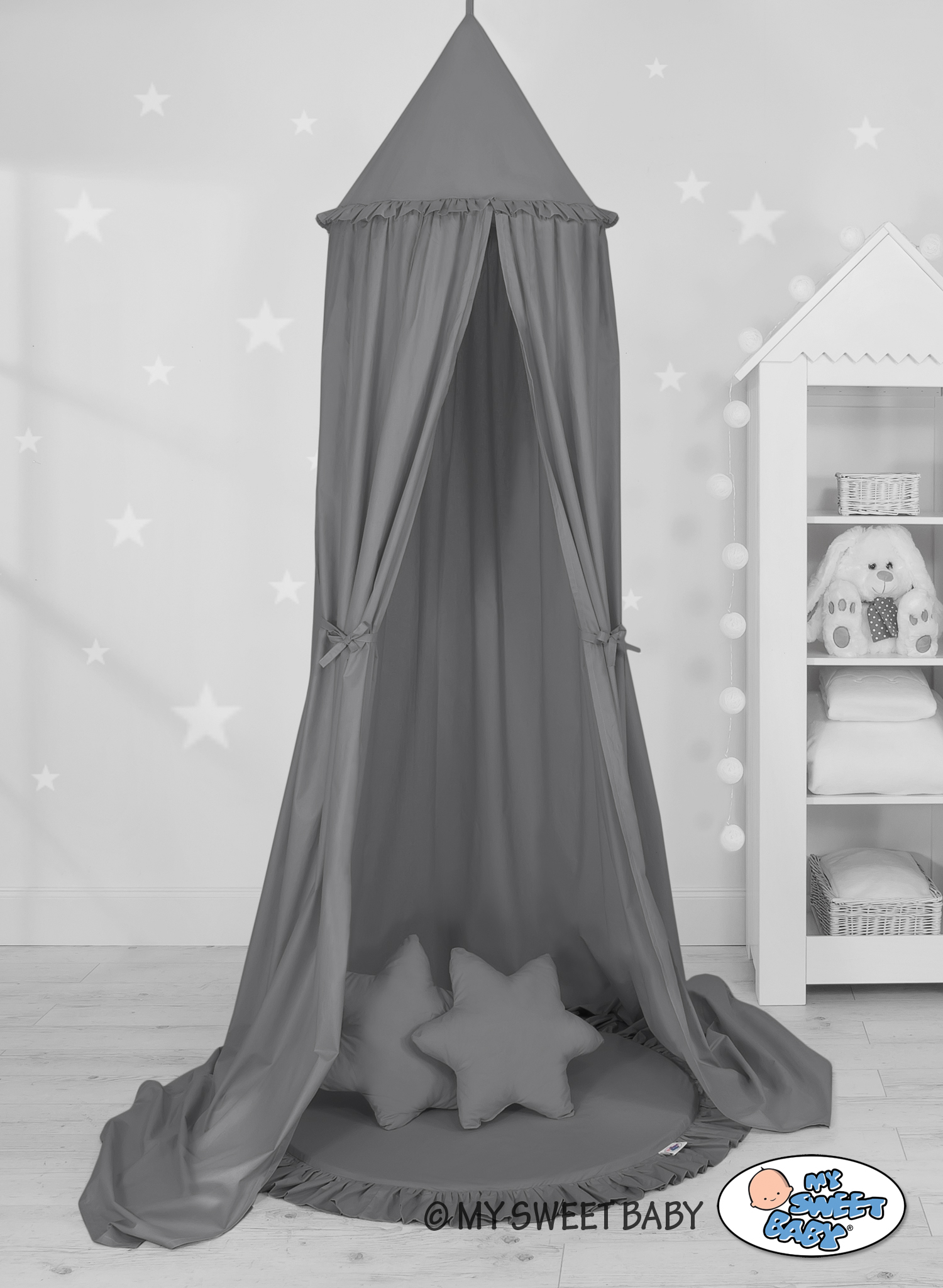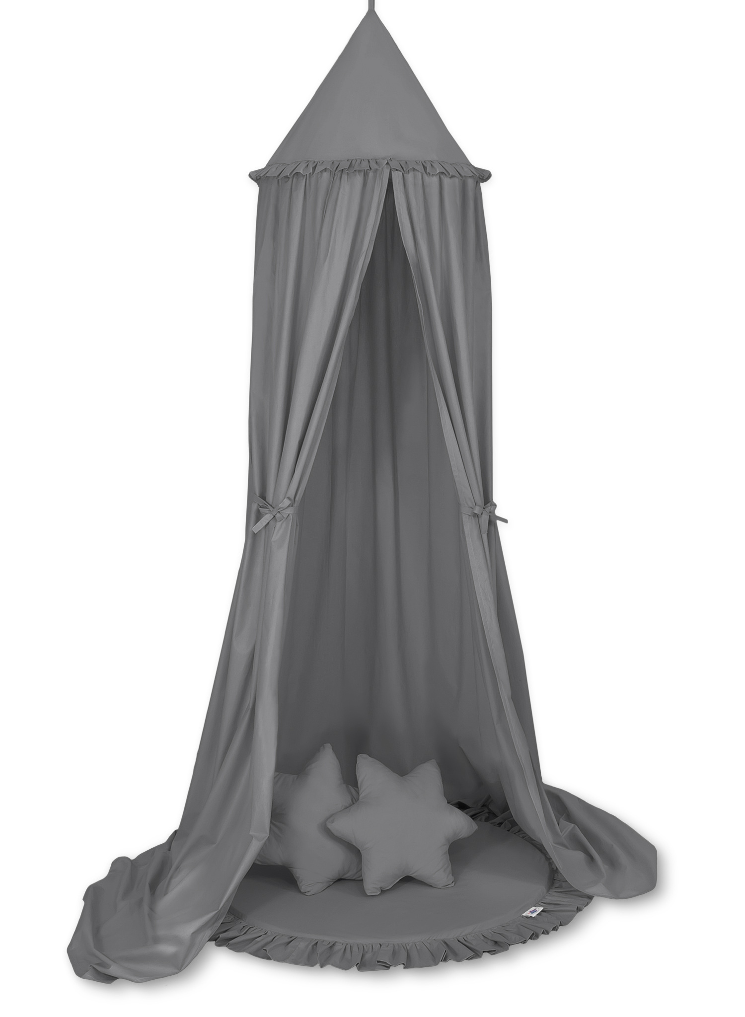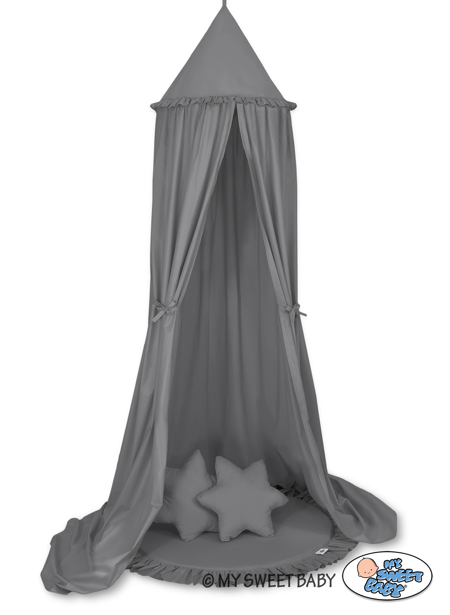 Der Himmelstoff besteht aus sicheren, 100% Baumwolle mit Ökotex Zertifikat. An den Seiten sind praktische Bändchen angenäht. Sie erlauben den Stoff je nach Bedarf oder Idee zusammen zu binden. Der Ring oben kann abgenommen werden. Der Himmelstoff ist bei 30 Grad waschbar. Der Betthimmel in Kombination mit weichen, bequemen Bodenmatte schafft einen perfekten Plaz zum spielen. Die Bodenmatte schützt vor Kälte und ist angenehm weich. Die Einlage kann aus der Spielmatte herausgenommen werden und der Bezug gewaschen werden. Der Spielmattenbezug ist aus reiner Baumwolle mit Ökotex Zertifikat hergestellt.