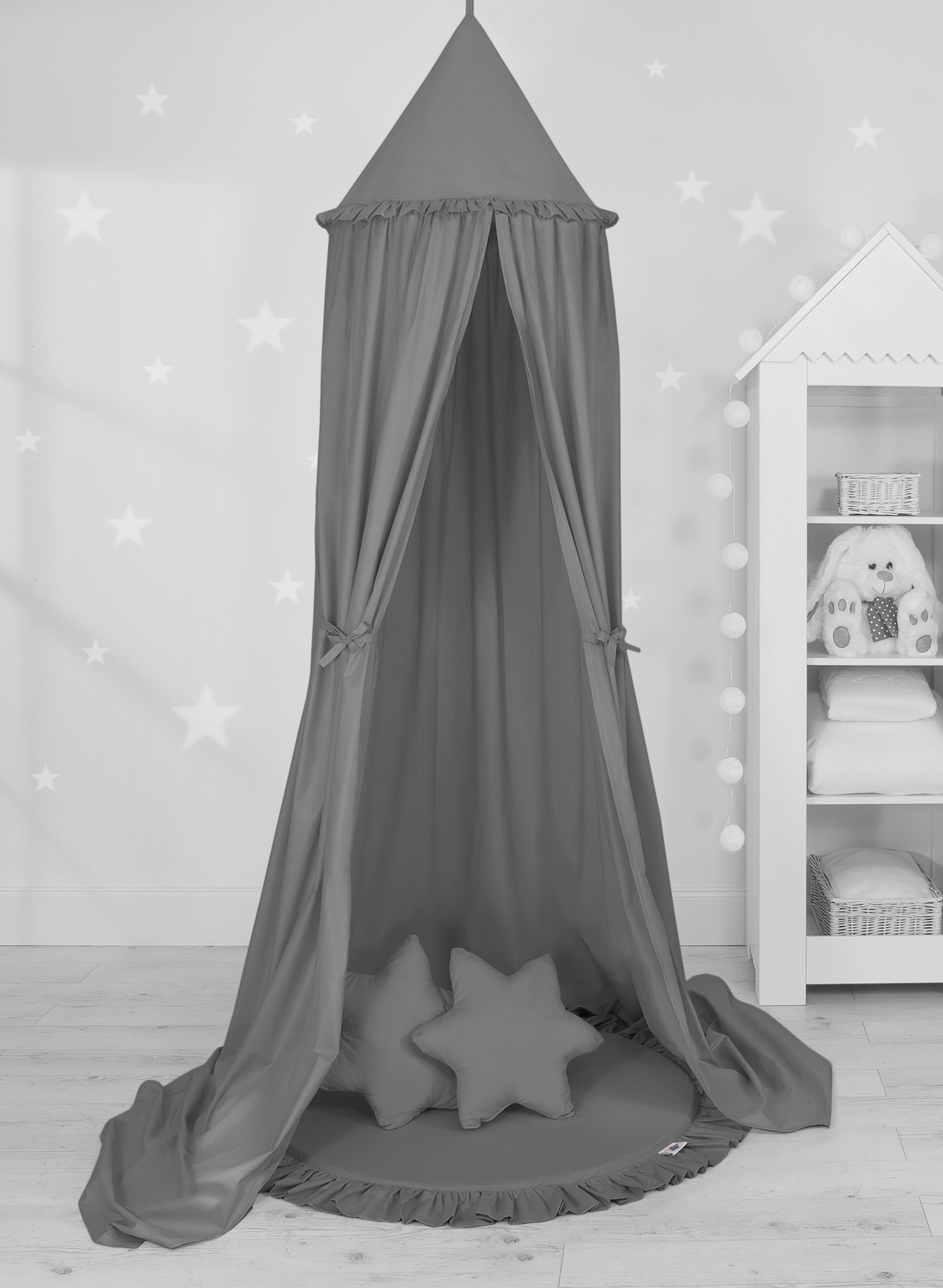 Ein effektvoller Hängehimmel für das Kinderzimmer. Unser Himmel kann als außergewöhnliche Dekoration, oder auch als ein gemütliches Spielplätzchen dienen. Über dem Kinderbett aufgehängt schützt der Himmel vor zu viel Licht und dämmt die Geräusche, so dass ein gemütlicher Ruheplatz entsteht. Der Himmel kann auch separat leicht an die Decke angebracht werden. Die Länge von 260 cm erlaubt die Enden am Boden zu drapieren. Somit entsteht ein Versteck und Spielplatz für ältere Kinder.