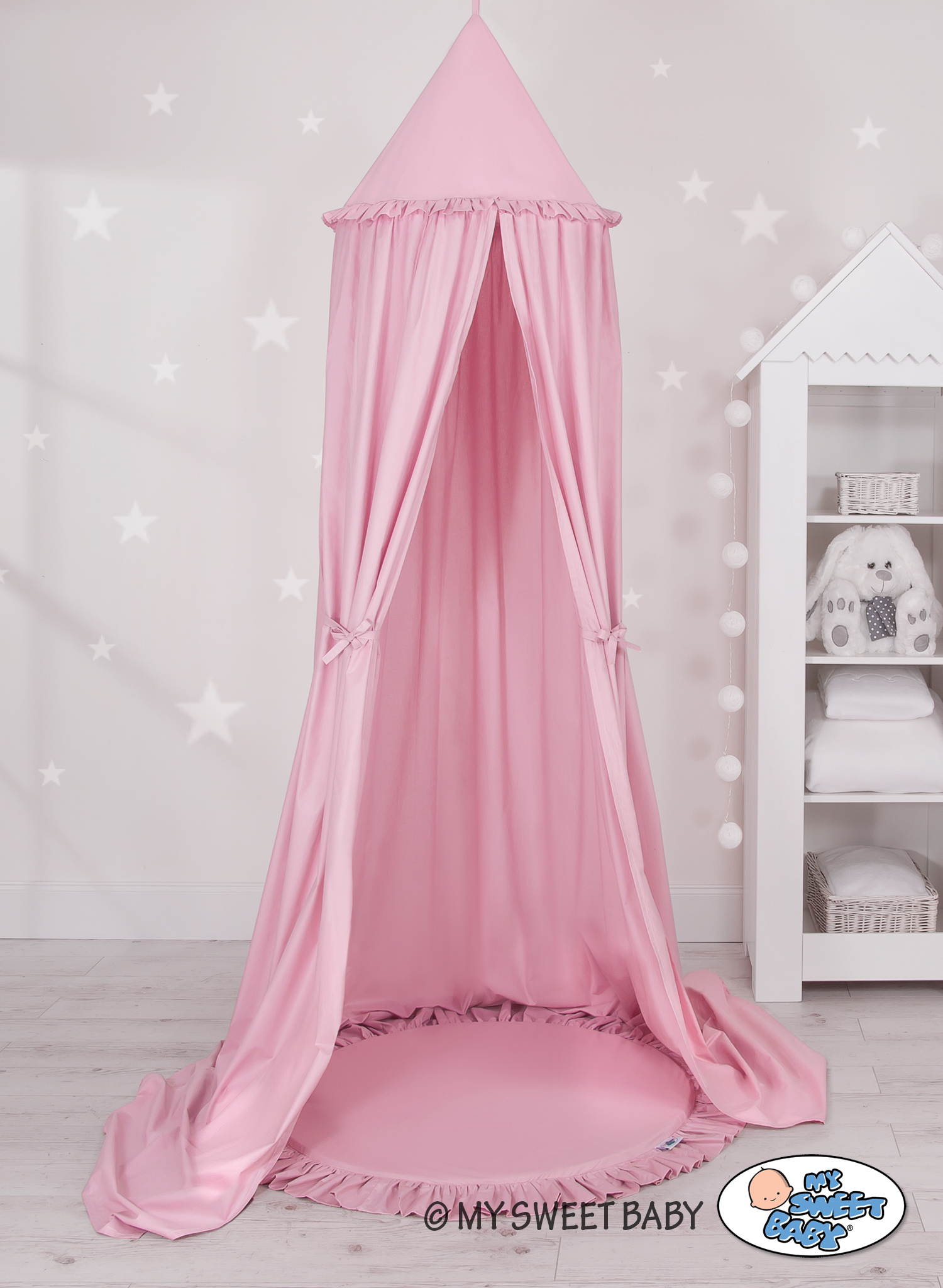 Der Himmelstoff besteht aus sicheren, 100% Baumwolle mit Ökotex Zertifikat. An den Seiten sind praktische Bändchen angenäht. Sie erlauben den Stoff je nach Bedarf oder Idee zusammen zu binden. Der Ring oben kann abgenommen werden. Der Himmelstoff ist bei 30 Grad waschbar. Der Betthimmel in Kombination mit weichen, bequemen Bodenmatte schafft einen perfekten Plaz zum spielen. Die Bodenmatte schützt vor Kälte und ist angenehm weich. Die Einlage kann aus der Spielmatte herausgenommen werden und der Bezug gewaschen werden. Der Spielmattenbezug ist aus reiner Baumwolle mit Ökotex Zertifikat hergestellt.