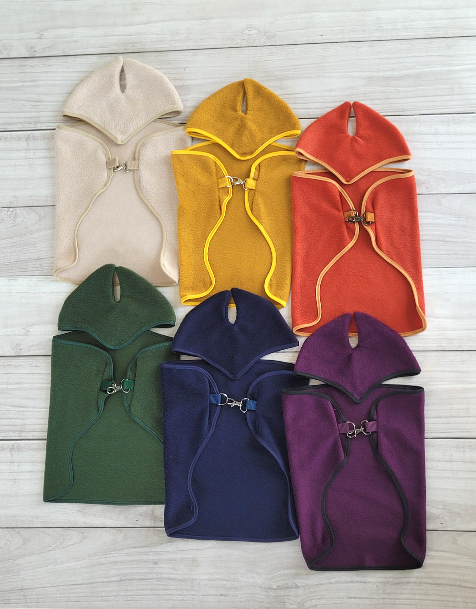 Die Decke und die Ohrenschützer sind aus Fleece mit farblich abgestimmten Umrandungen mit viel Liebe zum Detail gefertigt.  Die Decke wird mit einem Karabinerhaken und einem Halbring in Silber verschlossen.