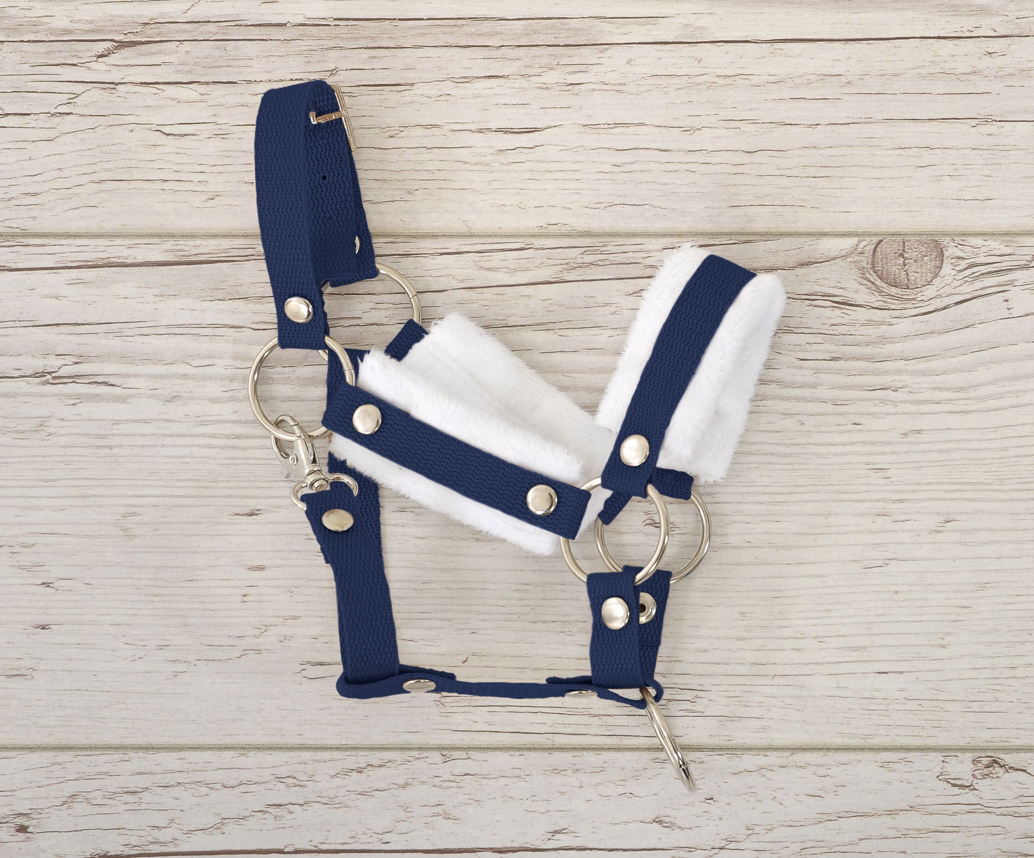Ein praktisches und haltbares Halfter mit Pelz für das Hobby-Pferd. Hergestellt aus hochwertigem Gurtband von 1,5 cm Breite und weichem Minky-Material. Verstellbare Schnalle für eine perfekte Anpassung an das Pferd. Einfacher Verschluss mit Karabinerhaken. Metallelemente des Halfters - wie die Verschlüsse, Metallringe, Schnalle zum Verstellen und Karabinerhakenverschluss in silberner Farbe. Alles elegant und praktisch. Das Halfter ist einfach zu handhaben, robust und schmutzabweisend. Es werden viele modische Farben angeboten, die perfekt auf unsere Hobbypferde abgestimmt werden können.