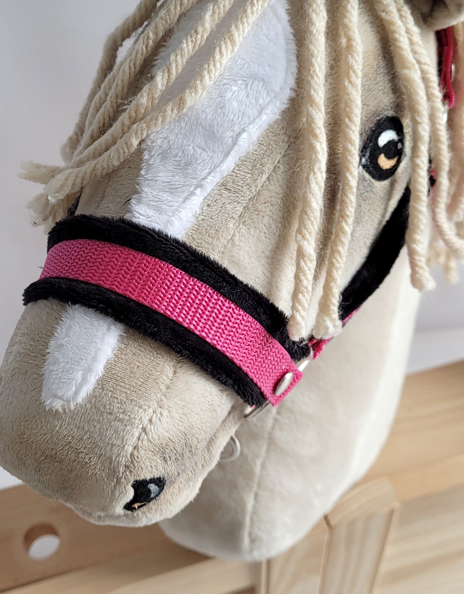 Ein praktisches und haltbares Halfter mit Pelz für das Hobby-Pferd. Hergestellt aus hochwertigem Gurtband von 1,5 cm Breite und weichem Minky-Material. Verstellbare Schnalle für eine perfekte Anpassung an das Pferd. Einfacher Verschluss mit Karabinerhaken. Metallelemente des Halfters - wie die Verschlüsse, Metallringe, Schnalle zum Verstellen und Karabinerhakenverschluss in silberner Farbe. Alles elegant und praktisch. Das Halfter ist einfach zu handhaben, robust und schmutzabweisend. Es werden viele modische Farben angeboten, die perfekt auf unsere Hobbypferde abgestimmt werden können.